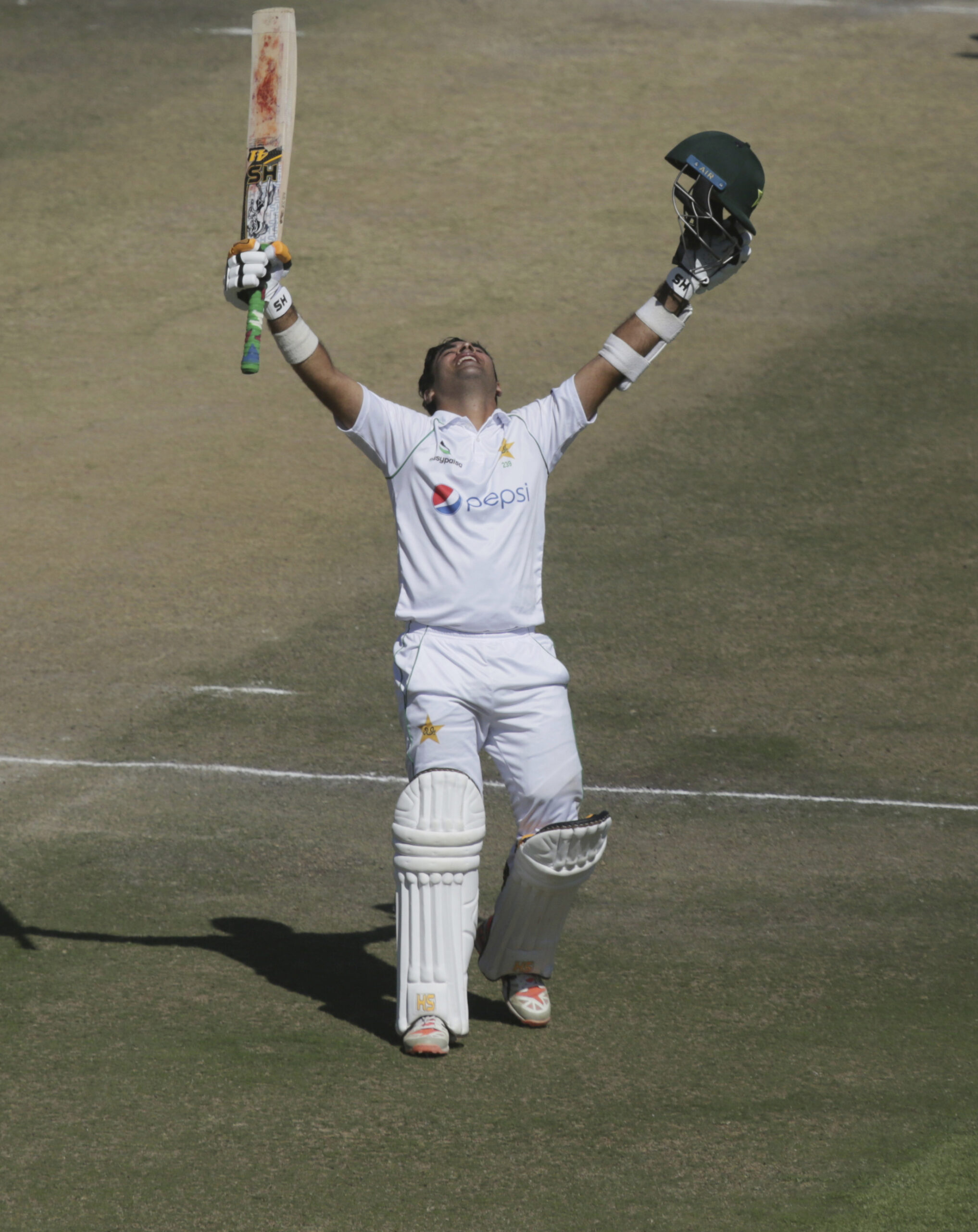 Harare: Pakistan batsman Abid Ali celebrates after scoring 200 runs during the second test cricket match against Zimbabwe at Harare Sports Club, Zimbabwe, Saturday, May, 8, 2021. AP/PTI Photo(AP05_08_2021_000195B)