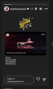 ଦୀପିକା ପାଦୁକୋନ ନିଜ ଇନଷ୍ଟାଗ୍ରାମ ଷ୍ଟାଟସରେ ଡନ-୩ର ଟିଜର ଶେୟାର କରିଛନ୍ତି। ଏଥିରେ ରଣବୀରଙ୍କ ଲୁକ ଦେଖାଯାଇଛି। ଭିଡିଓ ଶେୟାର କରିବା ପରେ ଦୀପିକା ବୁମ ଷ୍ଟିକର ଶେୟାର କରିଛନ୍ତି।