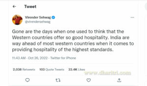 ଏହି କ୍ରମରେ ଟିମ୍ ଇଣ୍ଡିଆର ପୂର୍ବତନ ଓପନର ବିରେନ୍ଦ୍ର ସେହ୍ବାଗ ଭାରତୀୟ ଟିମ୍ ସହ ହୋଇଥିବା ଏଭଳି ବ୍ୟବହାରକୁ ନେଇ ବର୍ଷିଛନ୍ତି। ଟୁଇଟ୍ କରି ସେହ୍ବାଗ ଳେଖିଛନ୍ତି, ସେ ଦିନ ଗଲାଣି ଯେବେ ପଶ୍ଚିମ ଦେଶରେ ଭଲ ସୁବିଧା ମିଳୁଥିଲା। ସେମାନେ ଏସବୁ ମାମଲାରେ ଆଗରେ ଥିଲେ। ହେଲେ ଭାରତ ଏବେ ଆତିଥ୍ୟ ମାମଲାରେ ବହୁତ ଆଗରେ। ପଶ୍ଚିମ ଦେଶ ତୁଳନାରେ ଆମର ସୁବିଧା ବହୁତ ଭଲ ବୋଲି ସେ କହିଛନ୍ତି।