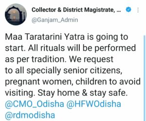 ବରିଷ୍ଟ ନାଗରିକ, ଗର୍ଭବତୀ ଓ ଶିଶୁଙ୍କୁ ଯାତ୍ରାକୁ ନ ଆସିବାକୁ ଜିଲାପାଳ ଟୁଇଟ୍ କରି ଅନୁରୋଧ କରିଛନ୍ତି। ଘରେ ରହି ସୁରକ୍ଷିତ ରୁହନ୍ତୁ ବୋଲି ଜିଲାପାଳ ଲୋକଙ୍କୁ ଅବଗତ କରାଇଛନ୍ତି।