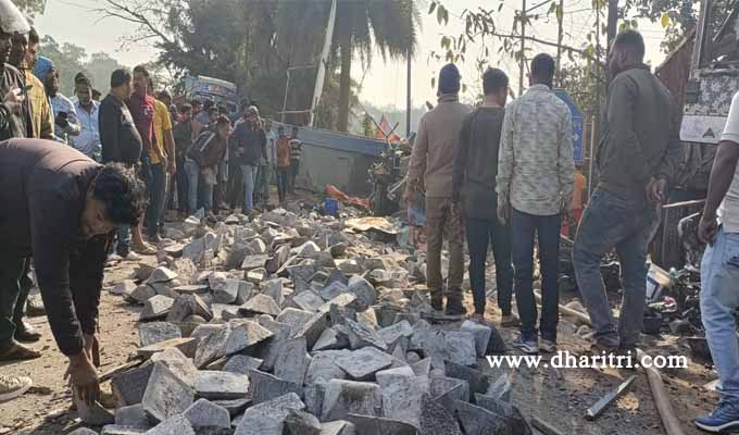 କେନ୍ଦୁଝର,୫ା୨(ନରେଶ ଚନ୍ଦ୍ର ପଟ୍ଟନାୟକ): ସୋମବାର ସକାଳେ କେନ୍ଦୁଝର ସହର ସ୍ଥାନୀୟ ଜୁଡ଼ିଆ ନିକଟରେ ଡବ୍ଲ୍ୟୁବି ୫୭ଡି/୬୩୩୪ ନମ୍ବର ବିଶିଷ୍ଟ ଆଇରନ ବୋଝେଇ ଟ୍ରକ୍ ସମ୍ବଲପୁର ଆଡ଼ୁ କେନ୍ଦୁଝର ଦେଇ ଯାଉଥିବା ବେଳେ ବ୍ରେକ୍ ଫେଲ୍ ହୋଇଯିବାରୁ ଅନ୍ୟ ୩ ଟ୍ରକ୍କୁ ଧକ୍କା ଦେଇ ରାସ୍ତାକଡ଼କୁ ଓଲଟି ପଡ଼ିଥିଲା। ଟ୍ରକ୍ଟି ଏକାଧିକ ବାଇକ୍ ଉପରେ ଚଢ଼ିଯିବାରୁ ଚୂରମାର ହୋଇଯାଇଛି। କେନ୍ଦୁଝର ସହର ଜୁଡ଼ିଆ ନିକଟରେ ଏହି ଦୁର୍ଘଟଣା ଘଟିଛି। କେହି ମୃତାହତ ହୋଇ ନ ଥିଲେ ହେଁ ବଡ଼ ଦୁର୍ଘଟଣାରୁ ବର୍ତ୍ତିଯାଇଛି। ସହରରେ ଭାରୀଯାନ ଚଳାଚଳ ଉପରେ କଟକଣା ଥିଲେ ମଧ୍ୟ ଉପଯୁକ୍ତ ତଦାରଖ ଅଭାବରୁ ଏଭଳି ଦୁର୍ଘଟଣା ପ୍ରଶାସନର ଅବହେଳାକୁ ଦାୟୀ କରିଛନ୍ତି। ରାସ୍ତାରେ କିଛି ସମୟ ଯାତାୟାତ ଠପ୍ ହୋଇଥିଲା।