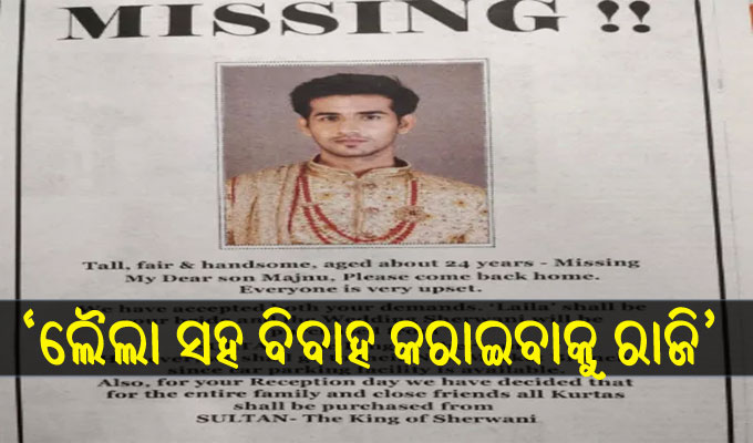 ଶେରଓ୍ବାନୀ ବ୍ରାଣ୍ଡ ‘ସୁଲତାନ୍’ର ବିଜ୍ଞାପନର ଉପରି ଭାଗରେ ଜଣେ ଯୁବକଙ୍କ ଫଟୋ ରହିଛି। ସେଥିରେ ସେ ଶେରଓ୍ବାନୀ ପିନ୍ଧିଛନ୍ତି। ସେଥିରେ ଲେଖାଯାଇଛି, ‘ଲମ୍ବା, ଗୋରା ଏବଂ ସୁନ୍ଦୀ, ପ୍ରାୟ ୨୪ ବର୍ଷର, ମୋ ପ୍ରିୟ ପୁତ୍ର ମଜନୁଙ୍କୁ ମନେ ପକାଯାଉଛି, ଦୟାକରି ଘରକୁ ଫେରି ଆସ। ସମସ୍ତେ ଚିନ୍ତାରେ ଅଛନ୍ତି। ଆମେ ତୋର ଦାବିକୁ ମାନି ନେଇଛୁ। ‘ଲୈଲା’ ହିଁ ତୋର ବଧୂ ହେବ। ଏହାଛଡ଼ା ତୋର ବିବାହର ଶେରଓ୍ବାନୀ ‘ସୁଲତାନ’-ଦ କିଙ୍ଗ ଅଫ୍ ଶେରଓ୍ବାନୀରୁ କିଣାଯିବ। କାର ପାର୍କିଂ ସୁବିଧା ଥିବାରୁ ଆମେ ତାର ନ୍ୟୁ ମାର୍କେଟ ବ୍ରାଞ୍ଚକୁ ଯିବା। ଏଥିସହ ତୋର ଭୋଜି ଲାଗି ସୁଲତାନ୍ରୁ ହିଁ ପୁରା ପରିବାର ଲାଗି କୁର୍ତ୍ତା କିଣାଯିବ ବୋଲି ଆମେ ନିଷ୍ପତ୍ତି ନେଇଛୁ।’
