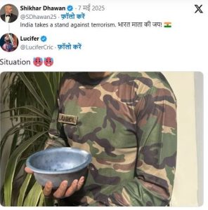 ଶିଖର ଧାୱନ ସୋସିଆଲ ମିଡିଆରେ ଏକ ପୋଷ୍ଟରେ ଲେଖିଛନ୍ତି ଯେ ଭାରତ ଆତଙ୍କବାଦ ବିରୋଧରେ କଠୋର କାର୍ଯ୍ୟାନୁଷ୍ଠାନ ଗ୍ରହଣ କରିଛି, ଭାରତ ମାତା କି ଜୟ।