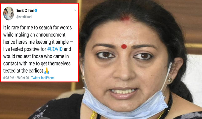 ନୂଆଦିଲ୍ଲୀ,୨୮ା୧୦: କେନ୍ଦ୍ରମନ୍ତ୍ରୀ ସ୍ମୃତି ଇରାନୀ କରୋନାରେ ଆକ୍ରାନ୍ତ ହୋଇଥିବା ଜଣାପଡ଼ିଛି। ଏନେଇ ବୁଧବାର ସନ୍ଧ୍ୟାରେ ସ୍ମୃତି ନିଜେ ଟୁଇଟ୍ କରି ସୂଚନା ଦେଇଛନ୍ତି।