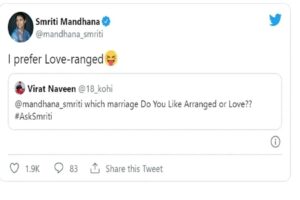 ସୋସିଆଲ ମିଡିଆରେ ବିରାଟ ନବୀନ ନାମକ ଜଣେ ୟୁଜର ସ୍ମୃତିଙ୍କୁ ଆପଣ ଲଭ୍ ମ୍ୟାରେଜ କରିବେ ନା ଆରେଞ୍ଜ ମ୍ୟାରେଜ କରିବେ ବୋଲି ପ୍ରଶ୍ନ କରିଥିଲେ। ସ୍ମୃତି ଏହାର ଉତ୍ତରରେ କହିଛନ୍ତି, ‘ଲଭ୍ ରେଞ୍ଜଡ୍’ କରିବି। ଏହାର ଅର୍ଥ ପ୍ରେମ କରିବି ଏବଂ ପରିବାର ଲୋକଙ୍କୁ ମନାଇ ଆରେଞ୍ଜ ମ୍ୟାରେଜ କରିବି। ସ୍ମୃତିଙ୍କ ଏହି ଉତ୍ତରକୁ ହଜାର ହଜାର ପ୍ରଶଂସକ ଲାଇକ୍ କରିଛନ୍ତି।