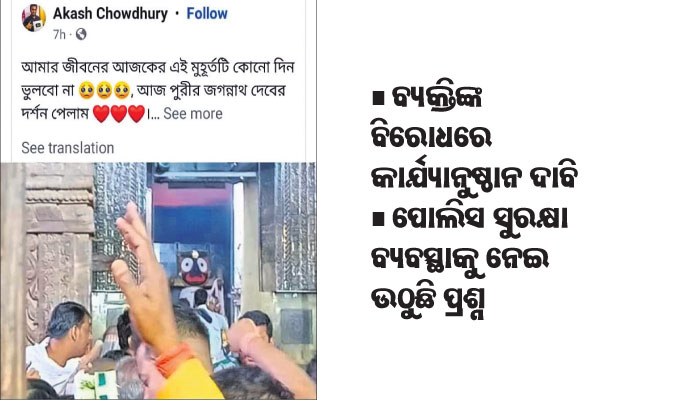 ପୁରୀ ଅଫିସ,୨୦।୧୧: ଶ୍ରୀମନ୍ଦିର ଭିତର ଫଟୋ ସୋସିଆଲ ମିଡିଆରେ ପୁଣିଥରେ ଭାଇରାଲ ହୋଇ୍ଛି। କିନ୍ତୁ ଏଥର ଶ୍ରୀମନ୍ଦିର ପରିସରର କାୈଣସି ସ୍ଥାନ ନୁହେଁ। ବରଂ ଶ୍ରୀମନ୍ଦିର ଗର୍ଭଗୃହ ଓ ରତ୍ନସିଂହାସନାରୂଢ ଚତୁର୍ଦ୍ଧାବିଗ୍ରହଙ୍କ ଫଟୋ ଭାଇରାଲ ହୋଇଛି। ଯାହାକୁ ନେଇ ଜଗନ୍ନାଥ ପ୍ରେମୀଙ୍କ ମଧ୍ୟରେ ଅସନ୍ତୋଷ ଦେଖିବାକୁ ମିଳିଛି। ଏ ଘଟଣା ସମ୍ପର୍କରେ ଶ୍ରୀମନ୍ଦିରର ଯୁବ ସେବାୟତମାନଙ୍କ ପକ୍ଷରୁ ସିଂହଦ୍ୱାର ଥାନା, ଜିଲାପାଳ ଏବଂ ଶ୍ରୀମନ୍ଦିର ମୁଖ୍ୟ ପ୍ରଶାସକଙ୍କୁ ଅଭିଯୋଗ କରିବା ସହ ଫଟୋ ଭାଇରାଲ କରିଥିବା ବ୍ୟକ୍ତିଙ୍କ ବିରୋଧରେ କାର୍ଯ୍ୟାନୁଷ୍ଠାନ ପାଇଁ ଦାବି କରିଛନ୍ତି। ସୂଚନା ଅନୁଯାୟୀ, ପଶ୍ଚିମବଙ୍ଗ ରାଜ୍ୟର ଜଣେ ବ୍ୟକ୍ତି ଯାହାଙ୍କ ନାମ ଆକାଶ ଚୌଧୁରୀ ଶ୍ରୀମନ୍ଦିର ଗର୍ଭଗୃହ ଓ ରତ୍ନସିଂହାସନାରୂଢ ମହାପ୍ରଭୁଙ୍କ ପ୍ରତିମୂର୍ତ୍ତିକୁ ଭାଇରାଲ କରିଥିବା ଜଣାପଡିଛି। ଆକାଶ ତାଙ୍କ ଫେସ୍ବୁକ୍ ଆକାଉଣ୍ଟରେ ମହାପ୍ରଭୁଙ୍କ ବିଗ୍ରହରର ଫଟୋ ଓ ଭିଡିଓ ଅପ୍ଲୋଡ କରିବା ସହ ବଙ୍ଗାଳାରେ କିଛି ଲେଖିଛନ୍ତି। ତେବେ ତାଙ୍କ ଫେସବୁକ୍ରେ ଏପରି ମହାପ୍ରଭୁଙ୍କ ଫଟୋ ପୋଷ୍ଟ କରିବାକୁ ନେଇ ସାଧାରଣରେ ଅସନ୍ତୋଷ ଦେଖାଯାଇଛି। ତେବେ ବାରମ୍ବାର ଶ୍ରୀମନ୍ଦିର ଭିତର ଏବଂ ରଥ ସମୟରେ ଗୁଣ୍ଡିଚା ମନ୍ଦିର ଭିତର ଫଟୋ ଭାଇରାଲ ହେବା ଓ ପୁଣି ସୋସିଆଲ ମିଡିଆରେ ଜଣେ ଭକ୍ତ ମହାପ୍ରଭୁଙ୍କ ବିଗ୍ରହକୁ ଭାଇରାଲ କରିବା ଘଟଣାକୁ ନେଇ ଶ୍ରୀମନ୍ଦିର ସୁରକ୍ଷା ବ୍ୟବସ୍ଥା ଉପରେ ପୁଣି ପ୍ରଶ୍ନ ଉଠିଛି। ମହାପ୍ରଭୁଙ୍କୁ ଶ୍ରୀମନ୍ଦିର ପରିସରରେ ଦର୍ଶନ କରିବା ନିମନ୍ତେ ରାଜ୍ୟ ତଥା ରାଜ୍ୟ ବାହାରୁ ବହୁ ଭକ୍ତ ମନ୍ଦିର ଆସୁଥିବା ବେଳେ ପୋଲିସ ପ୍ରଶାସନ ପକ୍ଷରୁ ବିଭିନ୍ନ ପର୍ଯ୍ୟାୟରେ ଭକ୍ତଙ୍କ ଯାଞ୍ଚ କରି ମନ୍ଦିରକୁ ଯିବାକୁ ଦିଆଯାଉଛି। ତେବେ ଏତେ ଯାଞ୍ଚ ସତ୍ତ୍ୱେ କିଭଳି କିଏ ମୋବାଇଲ ଫୋନ ନେଇ ମନ୍ଦିରକୁ ଯିବା ସହ ମହାପ୍ରଭୁଙ୍କ ଫଟୋ ଓ ଭିଡିଓ ଉଠାଇଲା ତାହାକୁ ନେଇ ପ୍ରଶ୍ନବାଚୀ ସୃଷ୍ଟି ହେଉଛି। ସୁରକ୍ଷା ବ୍ୟବସ୍ଥାକୁ କଡ଼ାକଡ଼ି କରିବା ପାଇଁ ପ୍ରଶାସନ ପକ୍ଷରୁ ସିସିଟିଭି କ୍ୟାମେରା ଲଗାଯିବା ସହ ବ୍ୟାପକ ପୋଲିସ ମୁତୟନ କରାଯାଇଛି। ମାତ୍ର ଏତେ ସୁରକ୍ଷା ବ୍ୟବସ୍ଥା ମଧ୍ୟରେ କିପରି ମୋବାଇଲ ଫୋନ ମନ୍ଦିର ମଧ୍ୟକୁ ଗଲା ତାହା ତଦନ୍ତ ସାପେକ୍ଷ। ସେହିପରି ଶ୍ରୀମନ୍ଦିର ଭିତରେ ଶ୍ରୀଜଗନ୍ନାଥ ମନ୍ଦିର ପୋଲିସ ଓ ସେବକମାନେ ମଧ୍ୟ ଉପସ୍ଥିତ ରହିଥାନ୍ତି। ତେବେ ସମସ୍ତଙ୍କ ନଜର ଆଢୁଆଳରେ କିପରି ଜଣେ ବ୍ୟକ୍ତି କିଛି ସମୟ ଠିଆ ହୋଇ ମୋବାଇଲ ଯୋଗେ ମହାପ୍ରଭୁଙ୍କ ଭିଡିଓ ଓ ଫଟୋ ଉଠାଇଲେ। ଅପରପକ୍ଷେ ଏପରି ଘଟଣା ବାରମ୍ବାର ଘଟୁଥିବା ବେଳେ ମଧ୍ୟ ପୋଲିସ ଏବଂ ଶ୍ରୀମନ୍ଦିର ପ୍ରଶାସନର ନୀରବତାକୁ ନେଇ ନାନା ସନ୍ଦେହ ଉଠୁଛି। ଏପରି କାର୍ଯ୍ୟ କରୁଥିବା ବ୍ୟକ୍ତିଙ୍କ ଉପରେ ପୋଲିସ ଯଦି ଆଖିଦୃଶିଆ କାର୍ଯ୍ୟାନୁଷ୍ଠାନ ନିଅନ୍ତା, ତେବେ ପୁଣି ଏପରି କାର୍ଯ୍ୟ ହୁଅନ୍ତା ନାହିଁ ବୋଲି ସାଧାରଣରେ ମତପ୍ରକାଶ ପାଇଛି। ତେବେ ଏ ଘଟଣାକୁ ସେବକ ସଂଘ ଓ ଶ୍ରୀମନ୍ଦିର ଯୁବ ସେବାୟତଙ୍କ ପକ୍ଷରୁ ଶନିବାର ଉକ୍ତ ବ୍ୟକ୍ତିଙ୍କ ବିରୋଧରେ କାର୍ଯ୍ୟାନୁଷ୍ଠାନ ଗ୍ରହଣ କରିବା ସହ ଏପରି ଘଟଣାର ତଦନ୍ତ କରିବାକୁ ଦାବି କରି ଜିଲାପାଳ ଏବଂ ଶ୍ରୀମନ୍ଦିର କମାଣ୍ଡରଙ୍କ ଜରିଆରେ ଶ୍ରୀମନ୍ଦିର ମୁଖ୍ୟ ପ୍ରଶାସକଙ୍