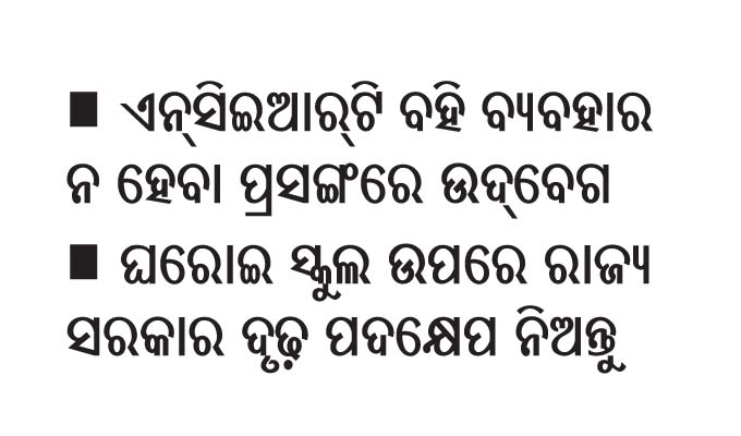 ସୂଚନାଯୋଗ୍ୟ, ରାଜ୍ୟରେ ବହୁ ଘରୋଇ ସ୍କୁଲ ପିଲାମାନଙ୍କୁ ଏନ୍ସିଇଆର୍ଟି ପୁସ୍ତକ ବଦଳରେ ଘରୋଇ ପ୍ରକାଶନ ପୁସ୍ତକ ନେବା ପାଇଁ ବାଧ୍ୟ କରୁଛନ୍ତି। ଏପରିକି ବହୁ ସ୍କୁଲରେ ଘରୋଇ ପ୍ରକାଶନ ପୁସ୍ତକ ହିଁ ପଢ଼ାଯାଉଛି। ଆଉ କିଛି ସ୍କୁଲରେ ଉଭୟ ଏନ୍ସିଇଆର୍ଟି ଏବଂ ଅନ୍ୟ ପ୍ରକାଶନ ପୁସ୍ତକ ପିଲାଙ୍କୁ ପଢ଼ାଯାଉଛି। ଏ ନେଇ ବହୁ ଅଭିଭାବକ ଅଭିଯୋଗ କଲେ ମଧ୍ୟ କୌଣସି ସୁଫଳ ମିଳିପାରୁ ନ ଥିବାରୁ କିଛିଦିନ ହେବ ଏହାକୁ ନେଇ ବିବାଦ ଲାଗି ରହିଛି।