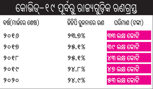 ନୂଆଦିଲ୍ଲୀ,୧।୮: କରୋନା ଭାଇରସ୍ ସଙ୍କଟ ଭାରତୀୟ ରାଜ୍ୟଗୁଡ଼ିକୁ ୮.୨୫ ଲକ୍ଷ କୋଟି ଟଙ୍କା ବା ୧୦ ବିଲିୟନ ଡଲାର ଋଣଭାରରେ ଡୁବାଇ ଦେଇପାରେ। ଉଭୟ କେନ୍ଦ୍ର ଓ ରାଜ୍ୟ ସ୍ତରରେ ରାଜସ୍ବ ଆଦାୟ ହ୍ରାସ ପାଇବାରେ ଲାଗିଥିବାରୁ ଏବେ ଋଣ କରିବା ଜରୁରୀ ହୋଇପଡ଼ିବ। ଭାରତର ରାଜ୍ୟଗୁଡ଼ିକ ଅନ୍ୟ ବ୍ରିକ୍ସ ଦେଶଗୁଡ଼ିକର ରାଜ୍ୟ ତୁଳନାରେ ଅଧିକ ଋଣ ନେଇସାରିଥିବା ବେଳେ ଚଳିତ ବର୍ଷ ଆହୁରି ଅଧିକ ପରିମାଣର ଋଣ ନେବାକୁ ବାଧ୍ୟ ହେବେ ବୋଲି ଏକ ଆକଳନରୁ ଜଣାପଡ଼ିଛି। କୋଭିଡ୍-୧୯ ଲକ୍ଡାଉନ୍ ଭାରତୀୟ ରାଜ୍ୟଗୁଡ଼ିକ ଉପରେ ଆର୍ଥିକ ପ୍ରହାର ପକାଇଛି। କେନ୍ଦ୍ରର ନରେନ୍ଦ୍ର ମୋଦି ସରକାର ରାଜ୍ୟଗୁଡ଼ିକୁ ସେମାନଙ୍କ ଅଂଶଧନ ଦେବା ପାଇଁ ସକ୍ଷମ ନ ଥିବାବେଳେ ରାଜ୍ୟଗୁଡ଼ିକ ଉପରେ ରାଜସ୍ବ ମାଡ଼ ପଡ଼ିଛି। ଏଭଳି ସ୍ଥିତିରେ ରାଜ୍ୟଗୁଡ଼ିକ ବଜାରରୁ ନେଉଥିବା ମୋଟ ଋଣର ପରିମାଣ ଚଳିତ ଆର୍ଥିକ ବର୍ଷରେ ୮.୨୫ ଲକ୍ଷ କୋଟି ଟଙ୍କା ବା ୧୦ ବିଲିୟନ ଡଲାର ଛୁଇଁବ ବୋଲି ରିସର୍ଚ୍ଚ ଏଜେନ୍ସି ଇଣ୍ଡିଆ ରେଟିଂ ପକ୍ଷରୁ କୁହାଯାଇଛି। ପୂର୍ବରୁ ଏହି ଋଣର ପରିମାଣ ୬.୦୯ ଲକ୍ଷ କୋଟି ଟଙ୍କା ହେବ ବୋଲି ଆକଳନ କରାଯାଇଥିଲା। ଅଶୋକା ୟୁନିଭର୍ସିଟିର ଅର୍ଥନୀତି ପ୍ରଫେସର ପୁଲାପ୍ରେ ବାଲାକ୍ରିଷ୍ଣନ୍ କହିଛନ୍ତି, ରାଜ୍ୟଗୁଡ଼ିକୁ ଦରମା, ଗୁରୁତ୍ୱପୂର୍ଣ୍ଣ ଯୋଜନା, କୋଭିଡ୍-୧୯ ଯୋଗୁ ସ୍ବାସ୍ଥ୍ୟସେବା କ୍ଷେତ୍ରରେ ବ୍ୟୟ ବୃଦ୍ଧି ଭଳି କେତେକ ଖର୍ଚ୍ଚ କରିବାକୁ ପଡ଼ିବ। ଏଥିଯୋଗୁ ଋଣ ବଢ଼ିବା ନିଶ୍ଚିତ। ରାଜ୍ୟ ରାଜସ୍ବର ୪୩% କେନ୍ଦ୍ର ସରକାରଙ୍କ ପାଖରୁ ଆସୁଥିବାବେଳେ ଅବଶିଷ୍ଟ ୫୭% ରାଜସ୍ବ ହେଉଛି ନିଜସ୍ବ ଟିକସ ଓ ଅଣଟିକସ ଆୟ।