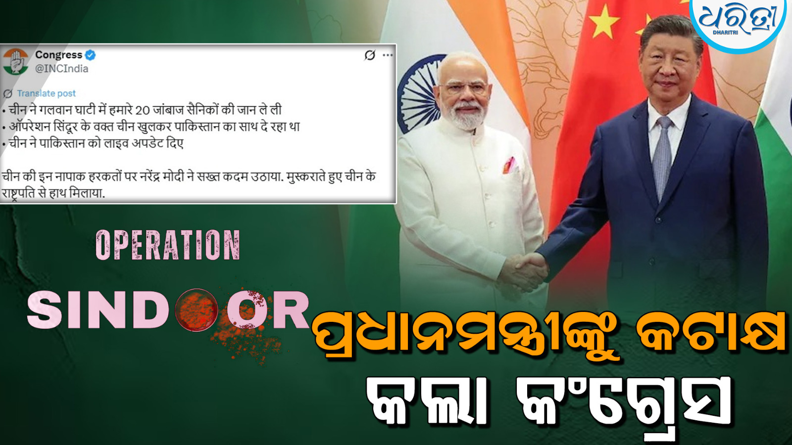 କଂଗ୍ରେସ୍ ସୋସିଆଲ ମିଡିଆରେ ଏକ ପୋଷ୍ଟ୍ କରିଛି, “ଚାଇନା ଗଲୱାନ୍ ଭ୍ୟାଲିରେ ଆମର ୨୦ ବୀର ସୈନିକଙ୍କ ଜୀବନ ନେଇଛି। ଅପରେସନ୍ ସିନ୍ଦୁର୍ ସମୟରେ ଚାଇନା ପାକିସ୍ତାନକୁ ଖୋଲା ସମର୍ଥନ ଦେଇଥିଲା। ଚାଇନା ପାକିସ୍ତାନକୁ ଲାଇଭ୍ ଆପ୍ଡେଟ୍ ଦେଇଥିଲା।” ଏହାପରେ “ଚାଇନାର ଏହି ଦୁର୍ବୃତ୍ତିମାନ କାର୍ଯ୍ୟକୁ ପ୍ରତିକ୍ରିୟାରେ ନରେନ୍ଦ୍ର ମୋଦି କଠୋର ପଦକ୍ଷେପ ନେଇଛନ୍ତି। ସେ ହସି ହସି ଚାଇନା ରାଷ୍ଟ୍ରପତିଙ୍କ ସହ ହ୍ୟାଣ୍ଡସେକ୍ କରିଛନ୍ତି।”
