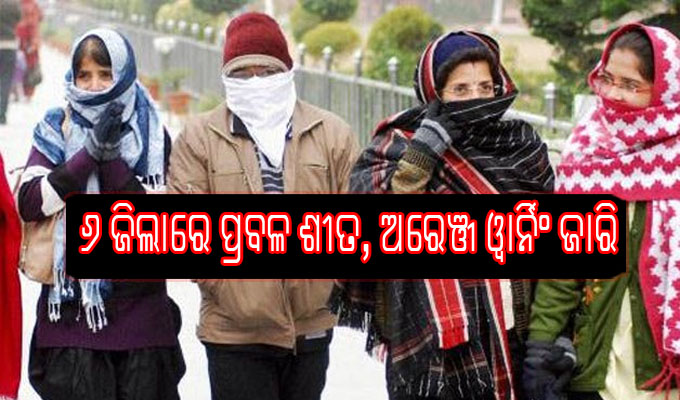 ସୋମବାର ସକାଳୁ ମଙ୍ଗଳବାର ସକାଳ ପର୍ଯ୍ୟନ୍ତ ୬ ଜିଲାରେ ପ୍ରବଳ ଶୀତ ପାଇଁ ଅରେଞ୍ଜ ୱାର୍ନିଂ ଜାରି କରାଯାଇଛି। ସେସେବୁ ଜିଲା ହେଲା ବରଗଡ଼, ସୁନ୍ଦରଗଡ଼, ଝାରସୁଗୁଡ଼ା, ଅନୁଗୋଳ, ମୟୂରଭଞ୍ଜ ଓ ଢେଙ୍କାନାଳ। ସେହିପରି ୧୫ ଜିଲା ପାଇଁ ୟେଲୋ ୱାର୍ନିଂ ଜାରି ହୋଇଛି। ଏହି ଜିଲାଗୁଡ଼ିକ ହେଲା କୋରାପୁଟ, କନ୍ଧମାଳ, ସମ୍ବଲପୁର, ସୋନପୁର, ବୌଦ୍ଧ, ଦେବଗଡ଼, କଳାହାଣ୍ଡି, ବଲାଙ୍ଗୀର, ନବରଙ୍ଗପୁର, ନୂଆପଡ଼ା, ବାଲେଶ୍ୱର, ଭଦ୍ରକ, କଟକ, ଯାଜପୁର ଓ କେନ୍ଦୁଝର। ମଙ୍ଗଳବାର ସକାଳୁ ବୁଧବାର ସକାଳ ପର୍ଯ୍ୟନ୍ତ ସୁନ୍ଦରଗଡ଼, ଝାରସୁଗୁଡ଼ା, ମୟୂରଭଞ୍ଜ, ଅନୁଗୋଳ, ବରଗଡ଼, କୋରାପୁଟ, କଳାହାଣ୍ଡି, ବୌଦ୍ଧ, ଢେଙ୍କାନାଳ ଓ କନ୍ଧମାଳରେ ପ୍ରବଳ ଶୀତ ଅନୁଭୂତ ହେବ। ତେଣୁ ଏହି ୧୦ ଜିଲାକୁ ୟେଲୋ ଓ୍ବାର୍ନିଂ ଜାରି କରାଯାଇଛି।