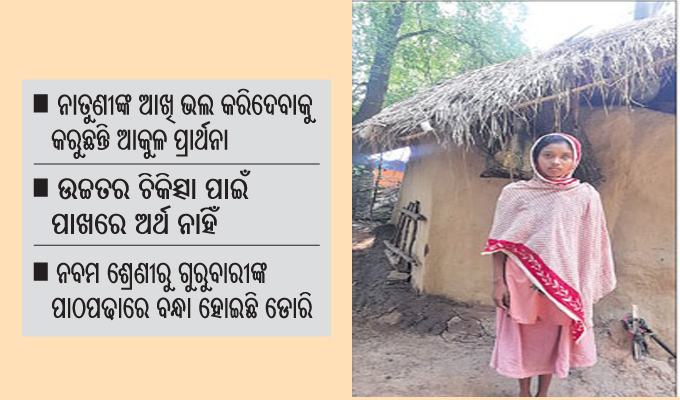 ଗୁରୁବାରୀଙ୍କ ଆଖି ସମସ୍ୟା ଯୋଗୁ ସେ ନବମ ଶ୍ରେଣୀରୁ ପାଠପଢା ଛାଡିଥିଲେ। ଆଖି ଭଲ କରିବା ଅଶାରେ ବୃଦ୍ଧା ନାଗବାଲ ନାତୁଣୀକୁ ଧରି ଜୟପୁର,କୋରାପୁଟ ଏବଂ ବିଶାଖାପାଟଣା ନେଇ ଚିକିତ୍ସା କରିଥିଲେ। ମାତ୍ର ଏଥିରୁ ତାଙ୍କୁ କିଛି ସୁଫଳ ମଳି ନ ଥିଲା। ଉଚ୍ଚତର ଚିକିତ୍ସା ପାଇଁ ନାତୁଣୀ ଗୁରୁବାରୀଙ୍କୁ କଟକ ବଡଡାକ୍ତରଖାନା ନେବାକୁ ଡାକ୍ତର ପରାମର୍ଶ ଦେଇଥିଲେ ମଧ୍ୟ ଅର୍ଥ ଅଭାବରୁ ନାତୁଣୀକୁ ସେଠାକୁ ନେଇ ପାରି ନ ଥିଲେ ବୃଦ୍ଧା ନାଗବାଲ୍। କୁଲିଭୂତି କରି ପରିବାର ଚଳାଉଥିବା ପୁଅ ଧବୁଲୁଙ୍କ ରୋଗରେ ମୃତ୍ୟୁ ପରେ ଗୁରୁବାରୀଙ୍କ ଦାୟିତ୍ୱ ପଡିଥିଲା ବୃଦ୍ଧା ନାଗବାଲଙ୍କ ଉପରେ। ନିଜ କୂଳ ରକ୍ଷା ଲାଗି ସେ ସେବେଠାରୁ ନାତୁଣୀ ଗୁରୁବାରୀର ଲାଳନପାଳନ କରିଆସୁଛନ୍ତି। ବିଦ୍ୟାଳୟରେ ପାଠ ପଢୁଥିବା ବେଳେ ଗୁରୁବାରୀଙ୍କ ବାମ ଆଖିରେ ପ୍ରଥମେ ସମସ୍ୟା ଦେଖାଦେଲା। ତାଙ୍କୁ ଭଲ କରିବାକୁ ବୃଦ୍ଧା ନାଗବାଲ୍ ମାଗିଯାଚି ନାତୁଣୀ ଗୁରୁବାରୀଙ୍କୁ କୋରାପୁଟ ଜିଲାରେ ଥିବା ସବୁ ଚିକିତ୍ସାଳୟକୁ ନେଇ ଚିକିତ୍ସା କରିଥିଲେ ମଧ୍ୟ କିଛି ସୁଫଳ ମିଳି ନ ଥିଲା। ଏବେ ସେ ଦୃଷ୍ଟିବାଧିତ ନାତୁଣୀକୁ ଧରି ଯେତିକି ହଇରାଣ ହେଉଛନ୍ତି ତାଙ୍କ ଚିନ୍ତାରେ ସେତିକି ଘାଣ୍ଟି ହେଉଛନ୍ତି। ମୁଣ୍ଡ ଗୁଞ୍ଜିବାକୁ ଘର ଟିକେ ନାହିଁ। ସରକାରୀ ଭାବେ ମିଳୁଥିବା ୫ କେଜି ଚାଉଳ ଉଭୟଙ୍କୁ ନିଅଣ୍ଟ ପଡୁଛି। ପେଟକୁ ଦି ମୁଠା ଖାଇବା ଯୋଗାଡ କରିବା କଷ୍ଟକର ହେଉଛି। ନାତୁଣୀପାଇଁ ସାହି ପଡିଶାଙ୍କଠାରୁ ମାଗିବାକୁ ପଡୁଛି ବୋଲି କହନ୍ତି ନାଗବାଲ୍। ଭଲ ଘର ଖଣ୍ଡେ ନ ଥିବାରୁ ଭଙ୍ଗାରୁଜା ଘରେ ମୁଣ୍ଡ ଗୁଞ୍ଜିଛନ୍ତି ଉଭୟେ। ଘରଟିଏ ପାଇଁ ସରପଞ୍ଚଠାରୁ ଆରମ୍ଭ କରି ବ୍ଳକ କାର୍ଯ୍ୟାଳୟ ପର୍ଯ୍ୟନ୍ତ ସମସ୍ତଙ୍କୁ କାକୁିମିନତି ହୋଇ କିଛି ସୁଫଳ ମିଳିନି ବୋଲି କହନ୍ତି ନାଗବାଲ୍ ଓ ତାଙ୍କ ନାତୁଣୀ ଗୁରୁବାରୀ। ବାରମ୍ବାର ଭତ୍ତା ପାଇଁ ଆବେଦନ କରି ଆମକୁ ମିଳିନି ବୋଲି କହନ୍ତି ଉଭୟେ।