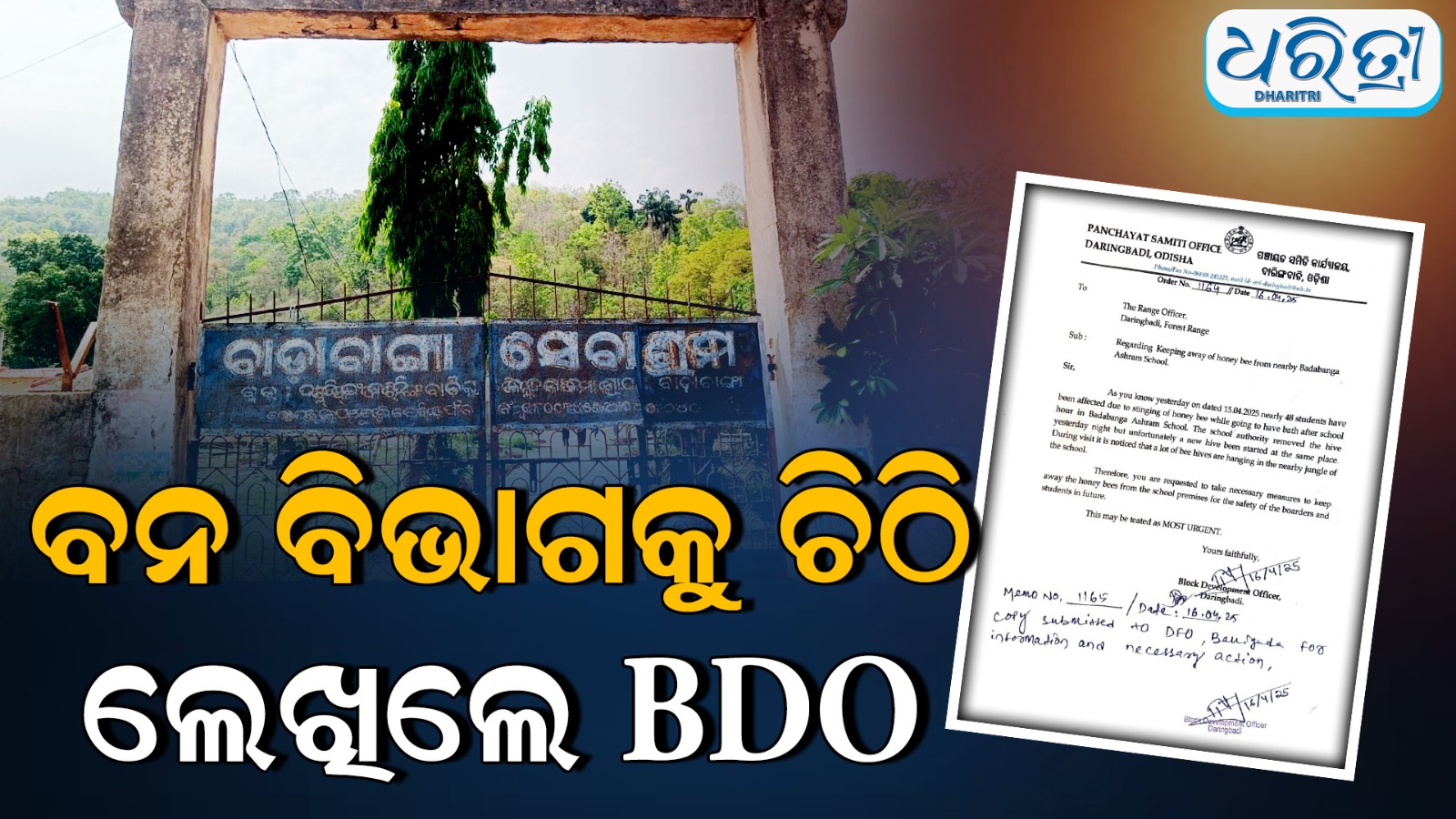 ଦାରିଙ୍ଗବାଡି,୧୬।୪ (ଅରୁଣ ସାହୁ)- କନ୍ଧମାଳ ଜିଲା ଦାରିଙ୍ଗବାଡି ବ୍ଲକ ବାଡାବାଙ୍ଗା ସେବାଶ୍ରମରେ ଛାତ୍ରୀଛାତ୍ରଙ୍କୁ ମହୁମାଛି ଆକ୍ରମଣ ଘଟଣା ଚିନ୍ତାର ବିଷୟ ପାଲଟିଥିଲା। ତେବେ ବୁଧବାର ମଧ୍ୟ ମହୁମାଛି ସେବାଶ୍ରମ ପରିସର ମଧ୍ୟରେ ଘୁରି ବୁଲୁଥିବା ଦେଖାଯାଇଛି। ଘଟଣା ଘଟିବା ଦିନ ବିଳମ୍ବିତ ରାତିରେ ମହୁମାଛି ବସାରେ ନିଆଁ ଲଗାଇ ପୋଡି ଦିଆଯାଇଥିଲା। କିନ୍ତୁ ପୁଣି ବୁଧବାର ଜଙ୍ଗଲରୁ ମହୁମାଛି ସେବାଶ୍ରମ ଭିତରକୁ ପଶିଆସିଥିଲେ ଓ ପୁଣି ସେହି ପୋଡ଼ାଯାଇଥିବା ସ୍ଥାନରେ ହିଁ ନୂଆ ବସା ତିଆରି କରିଥିଲେ। ଫଳରେ ଚିନ୍ତା ବଢିଥିଲା। କୌଣସି ଉପାୟ ନପାଇ ବିଡିଓ ପ୍ରୀତିରଞ୍ଜନ ରଥ ଏହାର ସ୍ଥାୟୀ ସମାଧାନ ପାଇଁ ଦାରିଙ୍ଗବାଡି ବନାଞ୍ଚଳ ଅଧିକାରୀ ଏବଂ ବାଲିଗୁଡା ଡିଫଓଙ୍କୁ ଚିଠି ଲେଖିଛନ୍ତି। ସେବାଶ୍ରାମ ପରିସରରୁ ମହୁମାଛିଙ୍କୁ ହଟାଇବା ସହ ନିକଟସ୍ଥ ଜଙ୍ଗଲରେ ଥିବା ମହୁମାଛି ବସାକୁ ନଷ୍ଟ କରି ଛାତ୍ରୀଛାତ୍ରଙ୍କୁ ସୁରକ୍ଷା ଦେବାକୁ ସେ ଚିଠିରେ ଜଣାଇଛନ୍ତି।