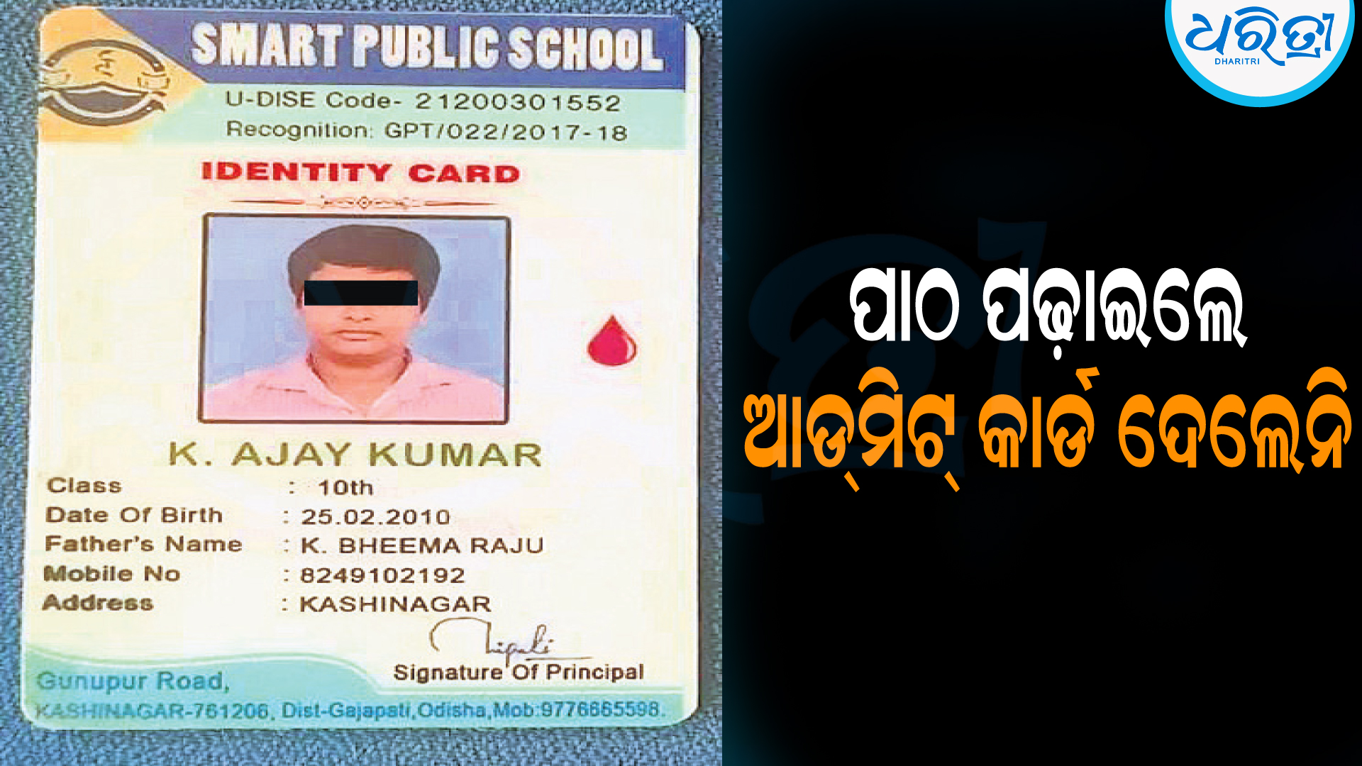 ମିଳିଥିବା ସୂଚନାନୁସାରେ, କାଶୀନଗରସ୍ଥିତ ସ୍ମାର୍ଟ ପବ୍ଲିକ ସ୍କୁଲରେ ପ୍ରଥମରୁ ୮ମ ଶ୍ରେଣୀ ପର୍ଯ୍ୟନ୍ତ ମୋଟ ୨୫୩ ପିଲା ପଢ଼ୁଛନ୍ତି। ଅଷ୍ଟମ ଶ୍ରେଣୀରେ ବର୍ତ୍ତମାନ ଛାତ୍ରୀଛାତ୍ରଙ୍କ ସଂଖ୍ୟା ୧୭। ୨୦୨୩-୨୪ରେ ଅଷ୍ଟମ ଶ୍ରେଣୀ ପାସ୍ କରିଥିତ୍ବା ଛାତ୍ର କେ. ଅଜୟ କୁମାର ସେହି ସ୍କୁଲରେ ନବମ ଓ ଦଶମ ଶ୍ରେଣୀ ପଢ଼ି ବାର୍ଷିକ ପରୀକ୍ଷା ଦେବାକୁ ପ୍ରସ୍ତୁତ ହୋଇଥିଲେ। ତାଙ୍କ ନିକଟରେ ସ୍ମାର୍ଟ ସ୍କୁଲର ପରିଚୟ ପତ୍ର(ଆଇ କାର୍ଡ) ମଧ୍ୟ ରହିଛି। ଆପାର ଆଇଡି ପ୍ରସ୍ତୁତ ପାଇଁ ସ୍କୁଲ ପକ୍ଷରୁ ତାଙ୍କଠାରୁ ସମସ୍ତ ଡକ୍ୟୁମେଣ୍ଟ ମଧ୍ୟ ନିଆଯାଇଛି। ଦଶମ ଶ୍ରେଣୀ ପରୀକ୍ଷା ନିମନ୍ତେ ଫର୍ମ ଫିଲପ ପାଇଁ ଆଧାର କାର୍ଡ ଜେରକ୍ସ ଓ ଶିକ୍ଷା ସମ୍ବନ୍ଧୀୟ ସମସ୍ତ ଡକ୍ୟୁମେଣ୍ଟ ସ୍କୁଲକୁ ଦିଆଯାଇଥିଲା। ସମ୍ପୃକ୍ତ ଛାତ୍ରଙ୍କୁ ଠିକ୍ ସମୟରେ ଆଡ୍ମିଟ କାର୍ଡ ଦିଆଯିବ ବୋଲି କୁହାଯାଇଥିଲା। ତେବେ ପରୀକ୍ଷା ପୂର୍ବଦିନ ଅର୍ଥାତ୍ ସୋମବାର ଆଧାର କାର୍ଡରେ ତ୍ରୁଟି ଦର୍ଶାଇ ଫର୍ମ ପୂରଣ ହୋଇ ପାରି ନ ଥିବା ସ୍କୁଲ କର୍ତ୍ତୃପକ୍ଷ କହିଥିବା ଜିଲାପାଳଙ୍କ ନିକଟରେ ଛାତ୍ର ଅଜୟଙ୍କ ମା’ ଅଭିଯୋଗ କରିଛନ୍ତି। ଜିଲାପାଳ ଅଭିଯୋଗର ସତ୍ୟତା ଯାଞ୍ଚ ପାଇଁ ଡିଇଓ ସାହୁଙ୍କୁ ତଦନ୍ତ ନିର୍ଦ୍ଦେଶ ଦେଇଛନ୍ତି। ଡିଇଓ ସାହୁ ଘଟଣାର ତଦନ୍ତ କରିଥିବାବେଳେ ସ୍ମାର୍ଟ ପବ୍ଲିକ ସ୍କୁଲରେ ନବମ ଓ ଦଶମ ଶ୍ରେଣୀ ପାଠପଢ଼ା ବ୍ୟବସ୍ଥା ନ ଥିବା ଜାଣିବାକୁ ପାଇଛନ୍ତି। ବିଦ୍ୟାଳୟ କର୍ତ୍ତୃପକ୍ଷ କିଭଳି ଜଣେ ଛାତ୍ରଙ୍କୁ ନବମ ଓ ଦଶମ ଶ୍ରେଣୀ ପଢ଼ିବାକୁ ସୁଯୋଗ ଦେଲେ ଏବଂ ତାଙ୍କୁ ପରିଚୟ ପତ୍ର ପ୍ରଦାନ କଲେ ତାକୁ ନେଇ ତଦନ୍ତ ଜାରି ରହିଛି ବୋଲି ଡିଇଓ କହିଛନ୍ତି। ପରୀକ୍ଷାରୁ ବଞ୍ଚତ୍ତ ଛାତ୍ରଙ୍କ ମା’ଙ୍କ କହିବା ହେଲା, ସ୍ମାର୍ଟ ପବ୍ଲିକ ସ୍କୁଲରେ ପାସ୍ କରିବା ପରେ ଆମେ ପୁଅକୁ ସେହି ସ୍କୁଲ୍ରେ ପଢ଼ାଉ ଥିଲୁ। ସେଠାରେ ନବମ ଓ ଦଶମ ଶ୍ରେଣୀ ନାହିଁ ବୋଲି ଆମେ ଜାଣି ନ ଥିଲୁ। ପୁଅକୁ ଉକ୍ତ ସ୍କୁଲରୁ ପରିଚୟ ପତ୍ର ମିଳିଛି। ଆମେ ୧୦ମ ପରୀକ୍ଷା ପାଇଁ ଫର୍ମ ଫିଲପ୍ ମଧ୍ୟ କରିଥିଲୁ। ହେଲେ ଶେଷରେ ବିଦ୍ୟାଳୟ କର୍ତ୍ତୃପକ୍ଷ ଆମ ପୁଅକୁ ଆର୍ଡମିଟ କାର୍ଡ ଦେଇପାରିଲେନି ବୋଲି ମା’ ଅଭିଯୋଗ କରିଛନ୍ତି। ଅପରପକ୍ଷରେ ସ୍ମାର୍ଟ ପବ୍ଲିକ ସ୍କୁଲ ପ୍ରିନ୍ସପାଲ ତିରୁପତି ପାଟିକା କହିଛନ୍ତି, ସ୍କୁଲ ବିରୋଧରେ ଆସିଥିବା ଅଭିଯୋଗ ଭିତ୍ତିହୀନ। ଆଇ କାର୍ଡ ନକଲି। ଦଶମ ପରୀକ୍ଷା ଦେଇପାରି ନାହାନ୍ତି ବୋଲି ଅଭିଯୋଗ ଆଣିଥିବା ଛାତ୍ର ଜଣଙ୍କ ବର୍ତ୍ତମାନ ପାରଳାଖେମୁଣ୍ଡିସ୍ଥିତ ବିକାଶ ବିଦ୍ୟା ନିକେତନରେ ନବମ ଶ୍ରେଣୀରେ ପଢ଼ୁଥିବା ପ୍ରିନ୍ସିପାଲ ପାଟିକା ସୂଚନା ଦେଇଛନ୍ତି।