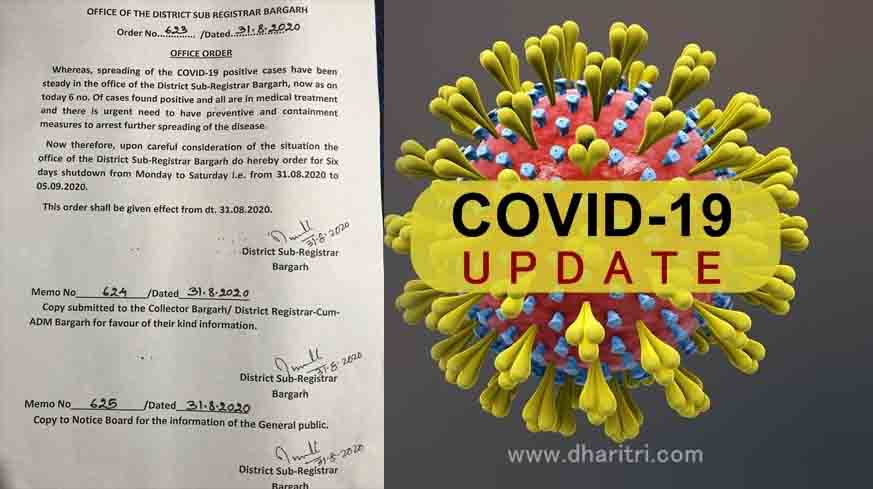 ବରଗଡ଼ ଅଫିସ,୩୧ା୮: କରୋନା ଥମିବାର ନାଁ ନେଉନି। ସୋମବାର ଜିଲାରେ ପୁଣି ୮୨ ଜଣ ନୂଆ ଆକ୍ରାନ୍ତ ଚିହ୍ନଟ ହୋଇଛନ୍ତି। ଜିଲା ସବ୍ରେଜିଷ୍ଟ୍ରାର ଅଫିସରେ କାର୍ଯ୍ୟରତ ୬ କର୍ମଚାରୀ କରୋନା ଆକ୍ରାନ୍ତ ହୋଇଛନ୍ତି। ଫଳରେ ସଂକ୍ରମଣକୁ ପ୍ରତିହତ କରିବା ପାଇଁ ସୋମବାରରୁ ଆସନ୍ତା ୫ ତାରିଖ ପର୍ଯ୍ୟନ୍ତ ଜିଲା ସବ୍ରେଜିଷ୍ଟ୍ରାର ଅଫିସକୁ ଶଟ୍ଡାଉନ ଘୋଷଣା କରାଯାଇଛି। ସୋମବାର ଏ ନେଇ ବରଗଡ଼ ଜିଲା ସବ୍ରେଜିଷ୍ଟ୍ରାର କାର୍ଯ୍ୟାଳୟର ଏକ ବିଜ୍ଞପ୍ତିରେ ସୂଚନା ଦିଆଯାଇଛି।