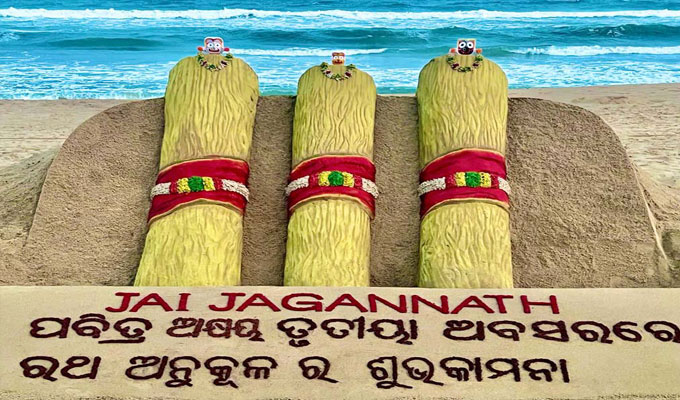 ପୁରୀ ଅଫିସ,୩।୫: ପବିତ୍ର ଅକ୍ଷୟ ତୃତୀୟା ଅବସରରେ ମହାପ୍ରଭୁଙ୍କ ବିଶ୍ବ ପ୍ରସିଦ୍ଧ ରଥଯାତ୍ରା ପାଇଁ ରଥ ନିର୍ମାଣ କାର୍ଯ୍ୟର ଅନୁକୂଳ କରାଯାଏ। ତେଣୁ ଏହି ଅବସରରେ ବାଲୁକା ଶିଳ୍ପୀ ସୁଦର୍ଶନ ପଟ୍ଟନାୟକ ପୁରୀ ବେଳାଭୂମିରେ ଏକ ବାଲୁକା କଳା ନିର୍ମାଣ କରି ରାଜ୍ୟବାସୀଙ୍କୁ ଅକ୍ଷୟ ତୃତୀୟା ଶୁଭେଚ୍ଛା ଜଣାଇଛନ୍ତି।