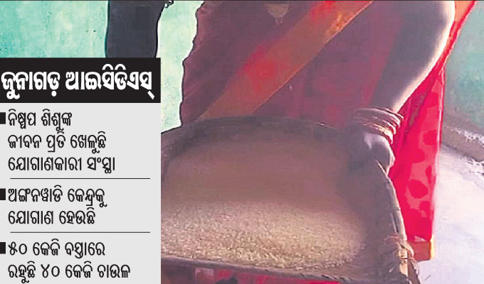 ଜୁନାଗଡ଼ ବ୍ଲକ ମାଲିଗୁଡା ସେଖପଡାରେ ଥିବା ମିନିଅଙ୍ଗନୱାଡି କେନ୍ଦ୍ରରେ ଗତ କିଛି ଦିନ ତଳେ ୫ ବସ୍ତା ଚାଉଳ ଯୋଗାଣ ହୋଇଥିଲା। ଏହି ଅଖାବସ୍ତାରେ ଥିବା ଚାଉଳ କେଉଁଠି ମଧ୍ୟ ୫୦ କେଜି ଚାଉଳ ନ ଥିଲା। କେଉଁ ବସ୍ତାରେ ୩୫ କେଜି ତ ଆଉ କେଉଁଟି ୪୦ କେଜି ରହିଥିଲା। ଅନ୍ୟ କିଛି ବସ୍ତା ଚାଉଳ ସଫା ଥିବା ବେଳେ ଆଉ ୨ଟି ବସ୍ତା ଚାଉଳରେ ବାଲି, ଗୋଡି, ମାଟି ମିଶିଥିଲା। ଏହାକୁ ନେଇ ଅଭିଭାବକଙ୍କ ମଧ୍ୟରେ ଉଦବେଗ ପ୍ରକାଶ ପାଇଛି। ଜୁନାଗଡ଼ ଆଇସିଡିଏସ ଅଧୀନ ୧୦ଟି ସେକ୍ଟର ଅଛି। ଏହି ସେକ୍ଟର ଅଧୀନରେ ଗ୍ରାମାଞ୍ଚଳର ଓ ସହରାଞ୍ଚଳ ମିଶି ୨୪୮ଟି ଅଙ୍ଗନୱାଡି କେନ୍ଦ୍ର ଅଛି। ୨୪୮ଟି କେନ୍ଦ୍ରରେ ୧୦ ହଜାର ୩୧୩ଜଣ ୩ରୁ ୬ ବର୍ଷର ଶିଶୁଙ୍କୁ ଗରମ ରନ୍ଧାଖାଦ୍ୟ ଦିଆଯାଉଛି। ଜୁନାଗଡ଼ ଆଇସିଡିଏସ୍ ଅଧୀନରେ ଥିବା ଅଙ୍ଗନୱାଡି କେନ୍ଦ୍ରକୁ ନବରଙ୍ଗପୁରର ଜିଲାର ଏକ ସଂସ୍ଥା ଚାଉଳ ଯୋଗାଣ କରିଥାଏ। ଚାଉଳ ଯୋଗାଣକାରୀ ସଂସ୍ଥା ବର୍ଷକୁ ୪ଥର ଚାଉଳ ଯୋଗାଉଥିବା ବେଳେ ପ୍ରତି ୩ ମାସରେ ଥରେ ସମ୍ପୃକ୍ତ ଯୋଗାଣକାରୀ ସଂସ୍ଥା ଅଙ୍ଗନୱାଡି କେନ୍ଦ୍ରକୁ ଚାଉଳ ଯୋଗାଣ କରିଥାଏ। ଏଥିରେ ପ୍ରଥମେ ଏପ୍ରିଲରୁ ଜୁନ, ଦ୍ୱିତୀୟରେ ଜୁଲାଇରୁ ସେପ୍ଟେମ୍ବର, ତୃତୀୟରେ ଅକ୍ଟୋବର ରୁ ଡିସେମ୍ବର ଓ ଚତୁର୍ଥରେ ଜାନୁୟାରୀରୁ ମାର୍ଚ୍ଚ ପର୍ଯ୍ୟନ୍ତ ଚାଉଳ ଯୋଗାଣ ହୋଇଥାଏ। ଜୁନାଗଡ଼ ଆଇସିଡିଏସ ଅଧୀନରେ ୧୦ ହଜାର ୧୧୩ ଜଣ ୩ରୁ ୬ ବର୍ଷର ଶିଶୁ ରନ୍ଧା ଖାଦ୍ୟ ଖାଇଥାନ୍ତି। ପ୍ରତିଦିନ ଜଣେ ଶିଶୁଙ୍କୁ ୮୦ ଗ୍ରାମ ହିସାବରେ ମାସକୁ ୨ କେଜି ଚାଉଳ ଦିଆଯାଇଥାଏ। ଜଣେ ଶିଶୁ ପିଛା ବର୍ଷକୁ ୨୪ କେଜି ହିସାବରେ୧୦ ହଜାର ୩୧୩ ଶିଶୁଙ୍କୁ ପ୍ରତିବର୍ଷ ୨ ହଜାର ୪୭୫ କୁଇଣ୍ଟାଲ ୨ କେଜି ଚାଉଳ ଯୋଗାଣ ହୋଇଥଏ। ଗୋଟିଏ ଚାଉଳ ଭର୍ତ୍ତି ଅଖାବୋରାରେ ୫୦ କେଜି ଚାଉଳ ରହିଥାଏ। ହେଲେ ଯୋଗାଣକାରୀ ସଂସ୍ଥା ଓ ଆଇସିଡିଏସ ମଧୁଚନ୍ଦ୍ରିକା ଯୋଗୁ ୫୦ କେଜି ଚାଉଳ ଅଙ୍ଗନୱାଡି କେନ୍ଦ୍ରକୁ ଗଲେ ତାହା କେତେବେଳେ ୩୫ କେଜି ତ ଆଉ କେତେବେଳେ ୪୦ କେଜି ହୋଇଥାଏ। ପ୍ରତି ବସ୍ତାରୁ ୧୦ରୁ ୧୫ କେଜି ଚାଉଳ କମ୍ ରହିଥାଏ। କମ ଚାଉଳ ଯୋଗାଣ ଯୋଗୁ କେନ୍ଦ୍ରରେ ଶିଶୁମାନଙ୍କୁ ଅନେକ ସମୟରେ ରନ୍ଧାଖାଦ୍ୟ ବନ୍ଦ କରି ଦିଆଯାଏ। କିଛି ଅଙ୍ଗନୱାଡି କର୍ମୀ ଚାଉଳ ମିଳିବା ଆଶାରେ ଉଦ୍ଧାରରେ ଚାଉଳ ଆଣି ଶିଶୁମାନଙ୍କୁ ଖାଇବାକୁ ଦେଇଥାନ୍ତି। ପରେ ଯଦି ଅଧିକାରୀମାନଙ୍କୁ ଏ ନେଇ ଅଭିଯୋଗ କଲେ ତାଙ୍କର ନାଲି ଆଖିର ଶିକାର ମଧ୍ୟ ହେଉଥିବା ଅଭିଯୋଗ ହେଉଛି। ଏହା ଉପରେ ଏକ ଭିଜିଲାନ୍ସସ୍ତରୀୟ ତଦନ୍ତ କରାଗଲେ ବହୁ ରହସ୍ୟ ଉନ୍ମୋଚିତ ହେବ ବୋଲି ସାଧାରଣରେ ଦାବି ହୋଇଛି। ଏ ନେଇ ଜୁନାଗଡ଼ ସିଡ଼ିପିଓ ଶୈଳଜା ଦାଶଙ୍କୁ ପଚାରିବାରୁ ମୁଁ ନୂଆରେ ଆସିଛି କ’ଣ ହୋଇଛି ବୁଝୁଛି ବୋଲି କହିଥିଲେ।