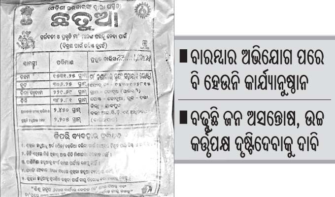 ବ୍ଲକ୍ର ମା’ ଚଣାଖାଇ ସ୍ବୟଂ ସହାୟିକା ଗୋଷ୍ଠୀ ୫ଟି ସେକ୍ଟରର ଗର୍ଭବତୀ, ଶିଶୁଙ୍କୁ ଖାଦ୍ୟ ଯୋଗାଇ ଦେଉଥିବା ବେଳେ ମା’ ରାମେଶ୍ୱରୀ ସ୍ବୟଂ ସହାୟିକା ଗୋଷ୍ଠୀ ଅବଶିଷ୍ଟ ଚାରୋଟି ସେକ୍ଟରକୁ ଶିଶୁ ଖାଦ୍ୟ ଯୋଗାଣ କରୁଛି। ନିୟମ ମୁତାବକ ପ୍ରତିମାସ ୨୩ରେ ଶିଶୁ ବିକାଶ ପ୍ରକଳ୍ପ ଅଧିକାରୀ, ସୁପରଭାଇଜର ଓ ମିଶନ ଶକ୍ତି ବିଭାଗ କର୍ମଚାରୀ ଛତୁଆ ପ୍ରସ୍ତୁତି କେନ୍ଦ୍ରରେ ଉପସ୍ଥିତ ରହି ଗହମ, ବୁଟ, ବାଦାମ, ଚିନି ଆଦି ସାମଗ୍ରୀର ଆନୁପାତିକ ପରିମାଣ ଯାଞ୍ଚ କରିବା କଥା। ୨୪ ଓ ୨୫ ତାରିଖରେ ଲଡୁ ପ୍ୟାକିଂ ଉପରେ ନଜର ଦେବା ସହ ଏହାର ମାନ ଯାଞ୍ଚ କରିବା କଥା। ତେବେ ମା’ ଚଣାଖାଇ ସ୍ବୟଂ ସହାୟିକା ଗୋଷ୍ଠୀ ବ୍ଲକ୍ ଅଧୀନ ବାଲିଆପାଳଠାରେ ଛତୁଆ ଓ ଲଡୁ ପ୍ରସ୍ତୁତ କରିବା ଯୋଗୁ ସୁପରଭାଇଜର ଓ ଶିଶୁ ବିକାଶ ପ୍ରକଳ୍ପ ଅଧିକାରୀ ଏହାର ମାନ ଯାଞ୍ଚ କରି ପାରୁଛନ୍ତି। ହେଲେ ମା’ରାମେଶ୍ୱରୀ ସ୍ବୟଂ ସହାୟିକା ଗୋଷ୍ଠୀ ବ୍ଲକ୍ର ୩୦ କି.ମି. ଦୂର ରସୁଲପୁର ବ୍ଲକ୍ରେ ଛତୁଆ ଓ ଲଡୁ ପ୍ରସ୍ତୁତ କରୁଥିବାରୁ ଏହାର ମାନ ଓ ଗୁଣବତ୍ତା ଯାଞ୍ଚ କରାଯାଉ ନ ଥିବା ଅଭିଯୋଗ ହେଉଛି। ସରକାରୀ ନିୟମ ମୁତାବକ କାର୍ଯ୍ୟାଳୟଠାରୁ କର୍ମଚାରୀମାନେ ୮ କି.ମି. ଦୂର ପରିଧି ଭିତରେ ରହିବାର ନିୟମ ଥିବା ବେଳେ ସୁପରଭାଇଜରମାନେ ୨୦ରୁ୨୫ କି.ମି. ଦୂରରେ ରହି ଉପର ଠାଉରିଆ ଭାବେ କାଗଜ କଲମରେ ଯାଞ୍ଚ କରାଯାଉଛି ବୋଲି ଦର୍ଶାଉଛନ୍ତି। ଏତଦ୍ବ୍ୟତୀତ ସୁପରଭାଇଜର ଓ ପ୍ରକଳ୍ପ ଅଧିକାରୀଙ୍କ ଅନୁପସ୍ଥିତିର ସୁଯୋଗ ନେଇ ପ୍ରସ୍ତୁତକାରୀ ସଂସ୍ଥା କୋମଳମତି ଶିଶୁ ଓ ଗର୍ଭବତୀଙ୍କୁ ନିମ୍ନମାନର ଖାଦ୍ୟ ଯୋଗାଣ କରି ମାଲାମାଲ ହେଉଛନ୍ତି ବୋଲି ମଧ୍ୟ ଅଭିଯୋଗ ହୋଇଛି। ଏ ସମ୍ପର୍କରେ ମା’ ଚଣାଖାଇ ସ୍ବୟଂ ସହାୟକ ଗୋଷ୍ଠୀ ସଭାପତି ସରିତା ଜେନାଙ୍କୁ ପଚାରିବାରେ ସେ କହିଛନ୍ତି, ଛତୁଆ ଓ ଲଡୁ ପ୍ରସ୍ତୁତ ସମୟରେ ବିଭାଗୀୟ କର୍ମକର୍ତ୍ତା ଉପସ୍ଥିତ ରହି ଏହାର ମାନ ଓ ଗୁଣବତ୍ତାକୁ ଯାଞ୍ଚ କରୁଛନ୍ତି। ଏହାପରେ ଆମେ ବିଭିନ୍ନ ଅଙ୍ଗନଓ୍ବାଡି କେନ୍ଦ୍ରକୁ ପଠାଉଛୁ। ତେଣୁ କୌଣସି ନିମ୍ନମାନ ଛତୁଆ ଓ ଲଡ଼ୁ ତିଆରି ହେଉନାହିଁ ବୋଲି ସେ ପ୍ରକାଶ କରିଛନ୍ତି। ମା’ ରାମେଶ୍ୱରୀ ସ୍ବୟଂ ସହାୟକ ଗୋଷ୍ଠୀ ସଭାପତିଙ୍କ ପ୍ରତିକ୍ରିୟା ପାଇଁ ଯୋଗାଯୋଗ କରାଯାଇଥିଲେ ମଧ୍ୟ ତାହା ସମ୍ଭବ ହୋଇ ପାରିନାହିଁ। ବରୀ ମହିଳା ଓ ଶିଶୁ ବିକାଶ ଭାରପ୍ରାପ୍ତ ପ୍ରକଳ୍ପ ଅଧିକାରୀ ସରିତା ନାୟକଙ୍କୁ ପଚାରିବାରେ ସେ କହିଛନ୍ତି, ମୁଁ ନୂତନ ଭାବେ ଦାୟିତ୍ୱରେ ଅଛି। କାର୍ଯ୍ୟାଳୟର ଗାଡ଼ି ନ ଥିବାରୁ କାର୍ଯ୍ୟ ତଦାରଖ କ୍ଷେତ୍ରରେ ଅସୁବିଧା ହେଉଛି। ଛତୁଆ ଓ ଲଡୁ ନିମ୍ନମାନର ବୋଲି ବିଭିନ୍ନ ଅଙ୍ଗନଓ୍ବାଡି କେନ୍ଦ୍ରର କର୍ମୀ ମୌଖିକ ଓ ଲିଖିତ ଅଭିଯୋଗ କରିଛନ୍ତି। ତେଣୁ ଖୁବ୍ଶୀଘ୍ର ଖାଦ୍ୟର ମାନ ଓ ଗୁଣବତ୍ତା ଉପରେ ତଦନ୍ତ କରାଯିବ। ଯଦି ଅଭିଯୋଗ ସତ୍ୟ ହୋଇଥାଏ ତେବେ ସେମାନଙ୍କ ବିରୋଧରେ କାର୍ଯ୍ୟାନୁଷ୍ଠାନ ଗ୍ରହଣ କରାଯିବ ବୋଲି ସେ ପ୍ରକାଶ କରିଛନ୍ତି।