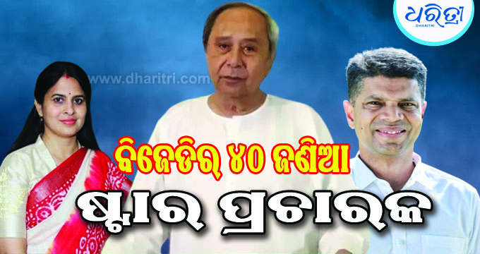 ୪୦ ଷ୍ଟାର ପ୍ରଚାରକ ତାଲିକା ଘୋଷଣା କଲା ବିଜେଡି; ମୁଖ୍ୟମନ୍ତ୍ରୀ ନବୀନ ପଟ୍ଟନାୟକ, କାର୍ତ୍ତିକ ପାଣ୍ଡିଆନ, ଶ୍ରୀମୟୀ ମିଶ୍ର ସାମିଲ ଭୁବନେଶ୍ୱର,୨୦ା୪(ଅନିଲ ଦାସ)-ଆସନ୍ତା ସାଧାରଣ ନିର୍ବାଚନ ପାଇଁ ଶନିବାର ବିଜେଡି ଷ୍ଟାର ପ୍ରଚାରକ ତାଲିକା ଘୋଷଣା କରିଛି । ଏଥିରେ ଦଳର ସଭାପତି ତଥା ମୁଖ୍ୟମନ୍ତ୍ରୀ ନବୀନ ପଟ୍ଟନାୟକଙ୍କ ସମେତ ୪୦ ଜଣ ରହିଛନ୍ତି। ଦଳର ଷ୍ଟାର ପ୍ରଚାରକମାନେ ହେଲେ କାର୍ତ୍ତିକ...