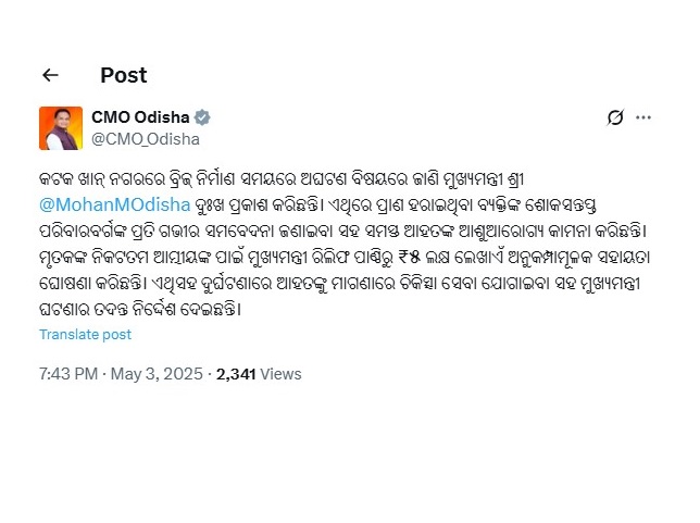 ଭୁବନେଶ୍ୱର, ୩ା୫(ସୁନିତ୍ ମିଶ୍ର): କଟକ ଖାନ୍ନଗରଠାରେ ବ୍ରିଜ୍ ନିର୍ମାଣ ସମୟରେ ଭୁଶୁଡ଼ି ପଡ଼ିବା ଯୋଗୁ ୩ ଜଣଙ୍କ ଜୀବନ ଯିବା ସହ ୨ ଜଣ ଗୁରୁତର ଆହତ ହୋଇଛନ୍ତି। ମୁଖ୍ୟମନ୍ତ୍ରୀ ମୋହନ ଚରଣ ମାଝୀ ଏହି ଅଘଟଣ ବିଷୟରେ ଜାଣିବା...