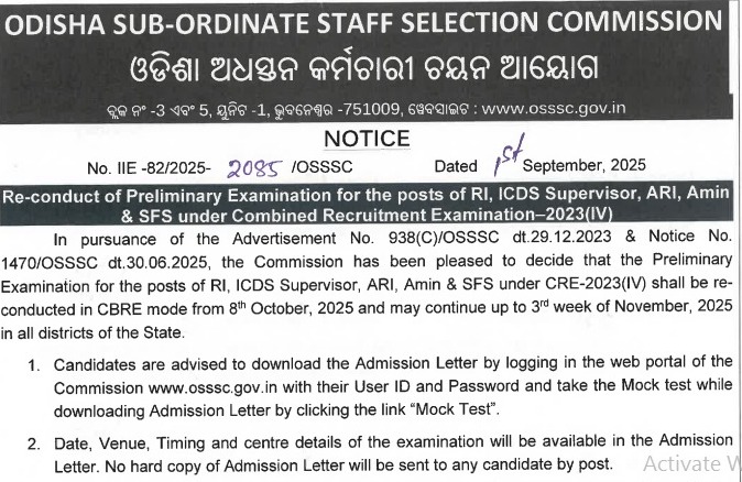 ଅକ୍ଟୋବର ୮ରୁ RI, ICDS ସୁପରଭାଇଜର, ARI, ଅମିନ ପରୀକ୍ଷା
