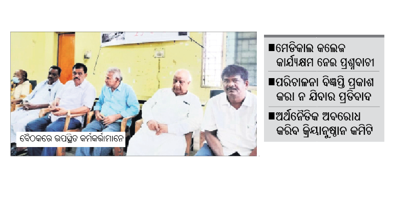 କ୍ରିୟାନୁଷ୍ଠାନ କମିଟି ଆବାହକ ପଦ୍ମଚରଣ ସାମଲଙ୍କ ସଭାପତିତ୍ୱରେ ପ୍ରେସ୍ କ୍ଲବ ଠାରେ ଏ ନେଇ ଏକ ବୈଠକ ଅନୁଷ୍ଠିତ ହୋଇଥିଲା। ଏଥିରେ ପୂର୍ବତନ ଏମ୍ପି ରବିନାରାୟଣ ପାଣି, ପୂର୍ବତନ ବ୍ଲକ ଅଧ୍ୟକ୍ଷ ଦିଗାମ୍ବର ଗଡନାୟକ, ପୂର୍ବତନ ନଗରପାଳ କେଶବ ଭୂତିଆ, ପୂର୍ବତନ ସମିତିସଭ୍ୟ ବିନୋଦ ଲାଲ୍, ମହିଳା ମହାବିଦ୍ୟାଳୟର ପୂର୍ବତନ ଅଧ୍ୟକ୍ଷା ଶୋଭାଗିନୀ ଦାସ, କଣିହଁା ଅଞ୍ଚଳର ପୂର୍ବତନ ସରପଞ୍ଚ ମହେଶ୍ୱର ପ୍ରଧାନ, ସୁକାନ୍ତ କୁମାର ଦାସ, ଅଭୟ ପାଣି, ପ୍ରଦୀପ ମହାରଣା, କଷ୍ଟୁ ସାମଲ, ସଞ୍ଜୀବ ନାଏକ, ଅନୁପ ସାହୁ, ଗଗନ ବିହାରୀ ଦାସ, ମନୋଜ ପ୍ରଧାନ, ମହି ସାହୁ, ନିଲମ୍ ଲାଲ୍ ପ୍ରମୁଖ ଉପସ୍ଥିତ ଥିଲେ। ଏଥିରେ କୁହାଯାଇଥିଲା ଯେ, ତାଳଚେର ମେଡିକାଲ କଲେଜ ପାଇଁ ୧୦୦୦ କୋଟି ଟଙ୍କା ଖର୍ଚ୍ଚ ହୋଇ ଭିତ୍ତିଭୂମି ପ୍ରସ୍ତୁତି ହୋଇଥିଲେ ହେଁ ଏପର୍ଯ୍ୟନ୍ତ କାର୍ଯ୍ୟକ୍ଷମ ନ ହେବା ଦୁଃଖର ବିଷୟ। ପୂର୍ବରୁ କମିଟି ପକ୍ଷରୁ ଆନ୍ଦୋଳନ ପାଇଁ ଡାକରା ଦିଆଯାଇଥିଲା। ହେଲେ ପ୍ରଶାସନ ଏ ନେଇ ସମୟ ମାଗିବା ଯୋଗୁ ଆନ୍ଦୋଳନକୁ ସ୍ଥଗିତ ରଖାଯାଇଥିଲା। କିନ୍ତୁ କେବେଠାରୁ ମେଡିକାଲ କଲେଜ କାର୍ଯ୍ୟକ୍ଷମ ହେବ ସେ ନେଇ ସରକାର ବିଦ୍ଧିବଦ୍ଧ ଭାବେ ବିଜ୍ଞପ୍ତି ପ୍ରକାଶ କରି ନ ଥିବାରୁ କ୍ରିୟାନୁଷ୍ଠାନ କମିଟି ତାଳଚେର ବନ୍ଦ ଡାକରା ଦେଇଛି। ଏହି ବନ୍ଦକୁ ସଫଳ କରିବା ପାଇଁ ତାଳଚେରର ବୁଦ୍ଧିଜୀବୀ, ଶ୍ରମିକ, ବ୍ୟବସାୟୀ, ଛାତ୍ର, ଯୁବକ ଏବଂ ଅଞ୍ଚଳବାସୀ ସମ୍ପୂର୍ଣ୍ଣ ସହଯୋଗ କରିବା ସହିତ ୭୨ ଘଣ୍ଟିଆ ଅର୍ଥନୈତିକ ଆନ୍ଦୋଳନକୁ ସଫଳ କରିବାକୁ କ୍ରିୟାନୁଷ୍ଠାନ କମିଟି ଅନୁରୋଧ କରିଛି।