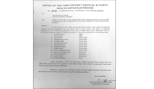 କେନ୍ଦୁଝର,୩୧ା୧୨(ସ୍ବ.ପ୍ର.): କେନ୍ଦୁଝର ଜିଲା ମୁଖ୍ୟ ଚିକିତ୍ସା ଅଧିକାରୀ (ସିଡିଏମଓ)ଙ୍କ ଦସ୍ତଖତ ଥାଇ ଏକ ଜାଲ ନିଯୁକ୍ତି ପତ୍ର ଭାଇରାଲ ହେବା ଘଟଣା ଜିଲାରେ ଚର୍ଚ୍ଚାର ବିଷୟ ହୋଇଛି। ନିଯୁକ୍ତି ପତ୍ରରେ ସରକାରୀ ମେଡିକାଲ କଲେଜ ଓ ହସ୍ପିଟାଲରେ ୧୪ ଜଣ ଏଏନ୍ଏମ୍, ଜୁନିୟର କ୍ଲର୍କ, ଆଟେଣ୍ଡାଣ୍ଟ, ପିଅନ ଆଦି କର୍ମଚାରୀ ସ୍ବାସ୍ଥ୍ୟ ବିଭାଗର କର୍ମଚାରୀ ନିଯୁକ୍ତିକୁ ନେଇ ଏହି ଚିଠି ଭାଇରାଲ ହେଉଛି। ଏହାକୁ ସ୍ବାସ୍ଥ୍ୟ ବିଭାଗ ପକ୍ଷରୁ ଖଣ୍ଡନ କରାଯାଇଥିବା ବେଳେ ଏନେଇ ଟାଉନ ଥାନାରେ ସିଡିଏମଓ ଲିଖିତ ଅଭିଯୋଗ କରିଛନ୍ତି। ଚିଠି ନମ୍ବର ୬୬୮୮/୨୮ ଡିମେମ୍ବର ୨୦୨୨ରେ ଏହି ଅଭିଯୋଗ କରିଛନ୍ତି। ସିଡିଏମଓ ଡ. କେ.ସି.ପୃଷ୍ଟି କହିଛନ୍ତି, ଏଭଳି ଖବର ଆସିବା ପରେ ସେ ଥାନାରେ ଲିଖିତ ଭାବେ ଜଣାଇଛନ୍ତି। ଏଥିରେ ସିଡିଏମଓ ଅଫିସର କର୍ମଚାରୀଙ୍କ ହାତ ଥାଇପାରେ ବୋଲି ସ୍ବୀକାର କରିଛନ୍ତି। ତେବେ ଏହି ନିଯୁକ୍ତି ପତ୍ର କେଉଁଠୁ ଓ କାହା ପାଖରୁ ଆସିଲା ସେ ନେଇ କାୈଣସି ସୂଚନା ଅଭିଯୋଗ ପତ୍ରରେ ନ ଥିବାରୁ ମାମଲା ରୁଜୁ ହୋଇନାହିଁ। ଏନେଇ ଥାନାରେ ଏକ କେସ ଡାୟରୀ ହୋଇଛି। ଆବଶ୍ୟକ ସୂଚନା ଦେଲେ ମାମଲା ରୁଜୁ ହେବ ବୋଲି ଟାଉନ ଥାନା ଅଧିକାରିଣୀ ପ୍ରମୋଦିନୀ ସାହୁ କହିଛନ୍ତି। ଏହି ନିଯୁକ୍ତି ପତ୍ର ସିଡିଏମଓ କେଉଁଠୁ ପାଇଲେ କିମ୍ବା ତାଙ୍କୁ କିଏ ଦେଲା ସେସବୁର ତଦନ୍ତ ହେଲେ ଏହି ସୂତାର ଖିଅ ଧରାପଡ଼ିଯିବ ବୋଲି ମତପ୍ରକାଶ ପାଉଛି। ନିଯୁକ୍ତି ପତ୍ରରେ ନିଯୁକ୍ତି ପାଇଥିବା ୧୪ ଜଣ ପ୍ରାର୍ଥୀଙ୍କ ନାମ ରହିଛି। ଏଣୁ କେହି ସେମାନଙ୍କଠାରୁ ଅର୍ଥ ଆଦାୟ ପାଇଁ ଏଭଳି କରିଥାଇ ପାରେ କିମ୍ବା ସିଡିଏମଓଙ୍କୁ ବଦନାମ କରିବାକୁ କରିଥିବ ତାହାର ତଦନ୍ତ ଦାବି ହେଉଛି।