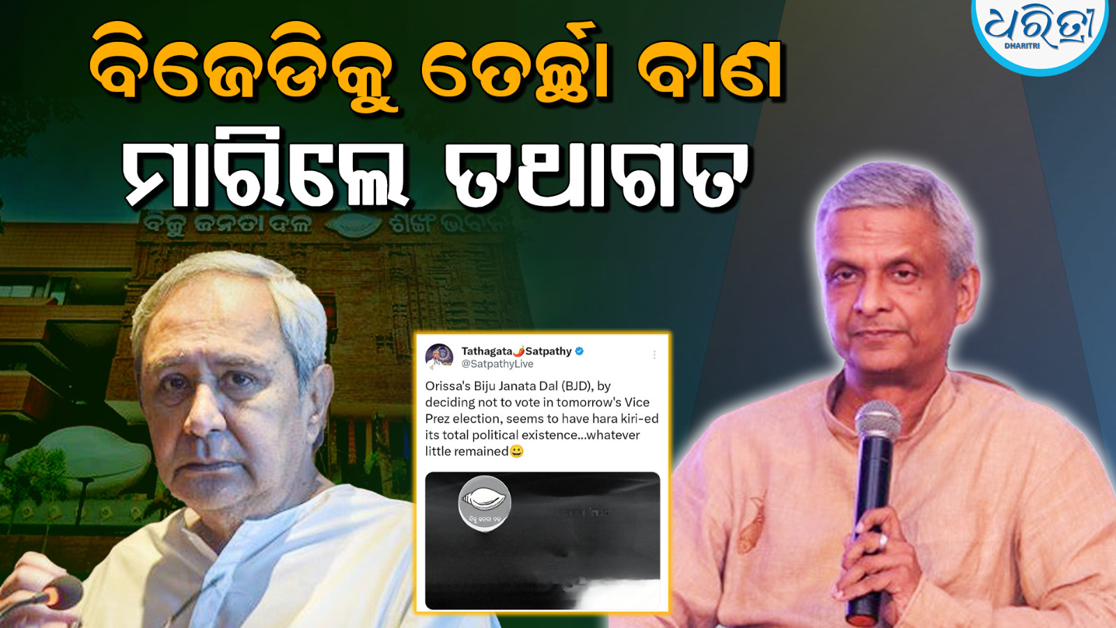 ଭୁବନେଶ୍ୱର,୯।୯: ଚାଲିଛି ଉପରାଷ୍ଟ୍ରପତି ନିର୍ବାଚନ। ଏହି ସମୟରେ ବିଜେଡିକୁ ତେର୍ଚ୍ଛା ବାଣ ମାରି ଚର୍ଚ୍ଚାକୁ ଆସିଛନ୍ତି ଧରିତ୍ରୀ ଏବଂ ଓଡ଼ିଶା ପୋଷ୍ଟର ସମ୍ପାଦକ ତଥାଗତ ସତପଥୀ। ଉପରାଷ୍ଟ୍ରପତି ନିର୍ବାଚନରେ ବିଜେଡି ଭୋଟ ନ ଦେବା ପାଇଁ ନିଷ୍ପତ୍ତି ନେବା ପ୍ରସଙ୍ଗରେ ସେ ବିଜୁ ଜନତା ଦଳକୁ ଟାର୍ଗେଟ୍ କରିଛନ୍ତି । ଏପରିକି ବିଜେଡିକୁ ପଲିଟିକାଲ ସୁଇସାଇଡ ବୋଲି କହିଛନ୍ତି । ଯାହା ବି କିଛି ରାଜନୈତିକ ଅସ୍ତିତ୍ୱ ବଞ୍ଚିଥିଲା ସେତେକ ବି ଗଲା ବୋଲି କହି ତାଚ୍ଛଲ୍ୟ କରିଛନ୍ତି ତଥାଗତ। ଏଥିପାଇଁ ସେ ଏକ ଜାପାନିଜ ଶବ୍ଦ hara kiri-ed ର ବ୍ୟବହାର କରିଛନ୍ତି । ଯାହାର ଅର୍ଥ ନିଜକୁ ନିଜେ ଶେଷ କରିବା। ଅର୍ଥାତ୍ ବର୍ତ୍ତମାନର ରାଜନୈତିକ ସ୍ଥିତି ଅନୁସାରେ ଏହାକୁ ପଲଟିକାଲ ସୁଇସାଇଡ ବୋଲି ତଥାଗତ ସତପଥୀ ଉଲ୍ଲେଖ କରିଛନ୍ତି। ଏହାସହ ବିଜେଡି ଲୋଗୋକୁ ଛାଡି ବାକି ଫଟୋରେ କଳା ବୋଳି ଏକ ଫଟୋକୁ ସୋସିଆଲ ମିଡିଆ ଏକ୍ସରେ ପୋଷ୍ଟ କରିଛନ୍ତି।