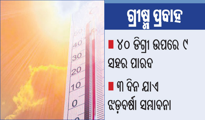 ଉପକୂଳରେ ତାପମାତ୍ରା ହ୍ରାସ ପାଇଥିଲେ ମଧ୍ୟ ଆଭ୍ୟନ୍ତରୀଣ ଓଡ଼ିଶାରେ ତାତି କଲବଲ କରୁଛି। ଅଧିକାଂଶ ଜିଲାରେ ପାରଦ ୪୦ ଡିଗ୍ରୀ ସେଲ୍ସିୟସ ଉପରେ ରହିଛି। ଆସନ୍ତା ୧୦ ତାରିଖ ଯାଏ ଆଭ୍ୟନ୍ତରୀଣ ଓଡ଼ିଶାରେ ଗ୍ରୀଷ୍ମ ପ୍ରବାହ ଜାରି ରହିବ। ଆଞ୍ଚଳିକ ପାଣିପାଗ କାର୍ଯ୍ୟାଳୟ ପକ୍ଷରୁ ମିଳିଥିବା ସୂଚନା ଅନୁଯାୟୀ ମାଲକାନଗିରିରେ ସର୍ବୋଚ୍ଚ ତାପମାତ୍ରା ୪୨ ଡିଗ୍ରୀ ସେଲ୍ସିୟସ ରେକର୍ଡ କରାଯାଇଥିବା ବେଳେ ଝାରସୁଗୁଡ଼ା ୪୧, ସମ୍ବଲପୁର ୪୧.୬, ସୁନ୍ଦରଗଡ଼ ୪୧, ହୀରାକୁଦ ୪୦.୫, ତାଳଚେର ୪୧.୫, ଭବାନୀପାଟଣା ୪୦.୫, ଟିଟିଲାଗଡ଼ ୪୧.୨, ବାରିପଦାରେ ସର୍ବାଧିକ ୪୦ ଡିଗ୍ରୀ ସେଲ୍ସିୟସ ରେକର୍ଡ କରାଯାଇଛି।