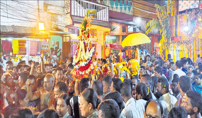 ବ୍ରହ୍ମପୁର ଅଫିସ,୮।୪: ବ୍ରହ୍ମପୁର ବୁଢ଼ୀ ସାଆନ୍ତାଣୀ ଠାକୁରାଣୀଙ୍କ ଦ୍ୱିବାର୍ଷିକ ଯାତ୍ରାର ୪ର୍ଥ ଦିନ ଶୁକ୍ରବାର ମା’ ଠାକୁରାଣୀଙ୍କ ଘଟ ବିଭିନ୍ନ ସାହି ପରିକ୍ରମା କରିଥିଲା। ଏଥିରେ ପାର୍ଶ୍ୱ ଘଟ ମଧ୍ୟ ରହିଥିଲେ। ରାତ୍ରି ପ୍ରାୟ ୯ଟା ପରେ ମା’ଙ୍କ ଘଟ ଅସ୍ଥାୟୀ ମଣ୍ଡପରୁ ବାହାରିଥିଲା। ପରେ ମହୁରୀ ରାଜବାଟିରେ ରାଜା ଅଶୋକ କୁମାର ନରେନ୍ଦ୍ରଦେବ ମା’ଙ୍କ ଘଟ ପୂଜାର୍ଚ୍ଚନା କରିଥିଲେ। ପରେ ମା’ଙ୍କ ଘଟ ପ୍ରଥମେ ବଡ ବଜାର ଅଞ୍ଚଳରେ ପହଞ୍ଚତ୍ଥିଲା। ଏହାପରେ କମଳାବାରୀ ସାହି, ସାଆନ୍ତାଣୀ ସାହି ଓ ମାର୍ଥାପେଟା ସାହିକୁ ଯାତ୍ରା କରିଥିଲେ। ଘଟ ପରିକ୍ରମା ସମୟରେ ପ୍ରତି ସାହିରେ ଶତାଧିକ ମହିଳା କଳସୀରେ ହଳଦୀ ପାଣି, ଆଳତୀ ଓ ଭୋଗ ଧରି ଅପେକ୍ଷା କରିଥିଲେ। ଘଟ ପରିକ୍ରମା ସମୟରେ ପ୍ରତି ସାହିରେ ନୂଆ ଶାଢି ପକାଯାଇଥିଲା। ମା’ଙ୍କ ଘଟ ଧରିଥିବା ଦେବକୀ ସେହି ଶାଢି ଉପରେ ଚାଲି ଚାଲି ଆସିଥିଲେ। ହଳଦୀ ପାଣିରେ ମହିଳାମାନେ ମା’ଙ୍କ ପାଦ ଧୋଇଥିଲେ। ଏଥିସହ ମୁଖ୍ୟ ଘଟକୁ ଆଳତୀ କରିବା ସହ ମହିଳାମାନେ ଭୋଗରାଗ ମଧ୍ୟ କରିଥିଲେ। ଘଟ ସମସ୍ତ ସାହି ପରିକ୍ରମା କରିବା ପରେ ମାର୍ଥାପେଟା ସାହି ଦେଇ ଦେଶୀ ବେହେରା ସାହି ସ୍ଥିତ ଅସ୍ଥାୟୀ ମଣ୍ଡପକୁ ଫେରିଥିଲେ। ଅସ୍ଥାୟୀ ମଣ୍ଡପରେ ଆଳତୀ ପରେ ଅନ୍ନ ଭୋଗ କରାଯାଇଥିଲା। ଏହି ସମୟରେ ମାଙ୍କ ଦର୍ଶନ ପାଇଁ ଅସ୍ଥାୟୀ ମଣ୍ଡପ ବାହାରେ ହଜାର ହଜାର ସଂଖ୍ୟକ ଭକ୍ତଙ୍କ ଲମ୍ବା ଧାଡି ଦେଖିବାକୁ ମିଳିଥିଲା।