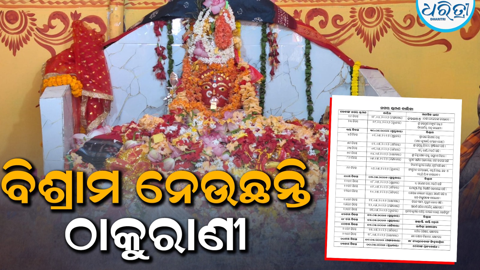 ଭଞ୍ଜନଗର,୨୭।୪(ବାବୁଲା ପ୍ରଧାନ):ଗଞ୍ଜାମ ଜିଲା ଭଞ୍ଜନଗର ଠାକୁରାଣୀ ଯାତ୍ରାର ଦେବୀଙ୍କ ଆଗମନ ଶାନ୍ତି ଶୃଙ୍ଖଳାର ସହ ସମାପନ ହୋଇଛି। ବ୍ୟାଘ୍ର ଦେବୀଙ୍କୁ କୁଲାଡରୁ ଏକ ବିରାଟ ଶୋଭାଯାତ୍ରାରେ ରବିବାର ଅଣାଯାଇଥିଲା। ରାତି ପ୍ରାୟ ୨ ଟା ସମୟରେ ଦେବୀ ଅସ୍ଥାୟୀ ମଣ୍ଡପରେ ପହଞ୍ଚି ବିଶ୍ରାମ ନେଇଥିଲେ। ଏହାପରେ ଠାକୁରାଣୀଙ୍କୁ ପୁଣି ଶୋଭାଯାତ୍ରାରେ ଅଣାଯାଇଥିଲା। ସୋମବାର ପ୍ରତ୍ୟୁଷ ପ୍ରାୟ ସାଢ଼େ ୪ ଟାରେ ଦେବୀ ଠାକୁରାଣୀ ଅସ୍ଥାୟୀ ମଣ୍ଡପରେ ପହଞ୍ଚି ବିଶ୍ରାମ ନେଇଥିଲେ। ସୋମବାର ଦେବୀ ବିଶ୍ରାମ ନେଇଥିବା ବେଳେ ମଙ୍ଗଳବାରଠାରୁ ଦେବୀଙ୍କ ନଗର ପରିକ୍ରମା ଆରମ୍ଭ ହେବ। ମଙ୍ଗଳବାର ଦେବୀ ଅସ୍ଥାୟୀ ମଣ୍ଡପରୁ ପୂର୍ବ ମୁଖା ହୋଇ ବାହାରିବା ପରେ ପୁରୁଣା ମେଡିକାଲ ଛକ ପର୍ଯ୍ୟନ୍ତ ଯିବେ। ସେଠାରୁ ପଶ୍ଚିମ ମୁଖା ହୋଇ ପୂରୁଣା ବଜାର ସାହି ହୋଇ ଡେରା ସାହି ଯିବେ ଦେଶୀ ବେହେରାଙ୍କ ବାସଭବନକୁ। ସେଠୀ ଦେବୀ ପୂଜାର୍ଚ୍ଚନା ପାଇବା ପରେ ପୁଣି ଅସ୍ଥାୟୀ ମଣ୍ଡପ ଅଭିମୁଖେ ବାହାରି ବିଶ୍ରାମ ନେବାର କାର୍ଯ୍ୟକ୍ରମ ରହିଛି। ଏଥିସହ ଆଜି ଯାତ୍ରା କମିଟି ପକ୍ଷରୁ ଦେବୀଙ୍କ ବିଭିନ୍ନ ଦିବସର ନଗର ପରିକ୍ରମା କାର୍ଯ୍ୟକ୍ରମ ପ୍ରକାଶିତ ହୋଇଛି। ଗତକାଲି ଦେବୀଙ୍କ ଆଗମନ ସମୟରେ ସହରରେ ଅସମ୍ଭାଳ ଭିଡ ପରିଲକ୍ଷିତ ହୋଇଥିଲା।