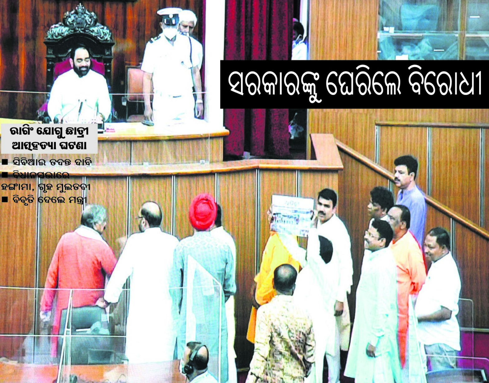 ସୋମବାର ପୂର୍ବାହ୍ନ ୧୦ଟା ୩୦ ମିନିଟ୍ରେ ବିଧାନସଭା ପ୍ରଶ୍ନକାଳ ଆରମ୍ଭ ହେବା ମାତ୍ରେ ବିଜେବି କଲେଜ ଛାତ୍ରୀ ଆତ୍ମହତ୍ୟା ଘଟଣାକୁ ନେଇ ଉଭୟ ଭାଜପା ଓ କଂଗ୍ରେସ ସଦସ୍ୟମାନେ ଗୃହର ମଧ୍ୟଭାଗକୁ ଆସି ପ୍ରବଳ ହଟ୍ଟଗୋଳ କରିଥିଲେ। ଭାଜପା ସଭ୍ୟ ମୋହନ ଚରଣ ମାଝି ‘ଧରିତ୍ରୀ’କୁ ଦେଖାଇ କହିଲେ ରାଗିଂରେ ଓଡ଼ିଶା ତୃତୀୟ ସ୍ଥାନରେ ରହିଛି। ଖବରକାଗଜରେ ଏହା ପ୍ରକାଶ ପାଇଛି। ଏହା ଅତ୍ୟନ୍ତ ସମ୍ବେଦନଶୀଳ ପ୍ରସଙ୍ଗ। ପ୍ରଶ୍ନକାଳ ବନ୍ଦ କରାଯାଇ ତୁରନ୍ତ ଏହା ଉପରେ ଆଲୋଚନା କରାଯାଉ। ପ୍ରଶ୍ନୋତ୍ତର କାର୍ଯ୍ୟକ୍ରମ ପରେ ଏହା ଉପରେ ଆଲୋଚନା କରିବାକୁ ବାଚସ୍ପତି କହିଥିଲେ ମଧ୍ୟ ବିରୋଧୀ ନିଜ ଜିଦ୍ରେ ଅଡ଼ିବସିଥିଲେ। ବାଚସ୍ପତି ବାଧ୍ୟହୋଇ ଗୃହକୁ ୧୦ଟା ୩୮ ମିନିଟ୍ରୁ ୧୧ଟା ୩୦ ଯାଏ ମୁଲତବୀ ଘୋଷଣା କରିଦେଇଥିଲେ।
