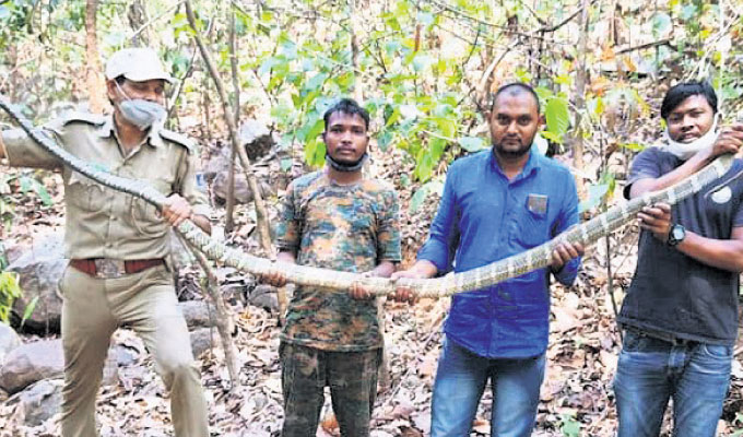 ବାଙ୍ଗିରିପୋଷି,୨୭।୪(ଡି.ଏନ.ଏ.): ମୟୂରଭଞ୍ଜ ଜିଲା ବାଙ୍ଗିରିପୋଷି ବନାଞ୍ଚଳ ଅନ୍ତର୍ଗତ ନିଶ୍ଚିନ୍ତା ଗ୍ରାମର ଅଧ୍ୟାପକ ଅଶୋକ କୁମାର ମହାପାତ୍ରଙ୍କ ଶୋଇବା ଘରୁ ୧୪ ଫୁଟ ଲମ୍ବ ଏକ ଅହିରାଜ ସାପ ଉଦ୍ଧାର ହୋଇଛି। ସ୍ନେକ୍ ହେଲ୍ପ ଲାଇନ୍ ଟିମ୍ ସଦସ୍ୟଙ୍କ ସହଯୋଗରେ ବନ କର୍ମଚାରୀମାନେ ଏହାକୁ ଉଦ୍ଧାର କରି ଶିମିଳିପାଳର ବିଦୁଭଣ୍ଡାର ଜଙ୍ଗଲରେ ଛାଡ଼ି ଦେଇଛନ୍ତି। ଅଧ୍ୟାପକ ମହାପାତ୍ରଙ୍କ ମା’ ସୋମବାର ଭୋର ସମୟରେ ବାଡ଼ିପଟ କବାଟ ଖୋଲିବା ସମୟରେ ହଠାତ ସାପଟି ତାଙ୍କ ଶୋଇବା ଘର ଭିତରକୁ ପଶି ଯାଇଥିଲା। ଖବରପାଇ ସ୍ଥାନୀୟ ରେଞ୍ଜର ଅଜୟ କୁମାର ଦାସଙ୍କ ନିର୍ଦ୍ଦେଶ କ୍ରମେ ବନ କର୍ମଚାରୀ ରଜତ କୁମାର ମହାନ୍ତ,ବିକାଶ ନାଏକ ଓ ସ୍ନେକ୍ ହେଲ୍ପ ଲାଇନ୍ ସଦସ୍ୟ କୃଷ୍ଣଚନ୍ଦ୍ର ଗୋଚ୍ଛାୟତ ଏବଂ ତାଙ୍କ ସାଥି ସେଠାରେ ପହଞ୍ଚି କୌଶଳକ୍ରମେ ଅହିରାଜକୁ ଧରିଥିଲେ। ଖାଦ୍ୟ ଅନ୍ବେଷଣରେ ସାପଟି ପାଖ ଜଙ୍ଗଲରୁ ବାହାରି ଆସିଥିବା ରେଞ୍ଜର ଦାସ ସୂଚନା ଦେଇଛନ୍ତି।