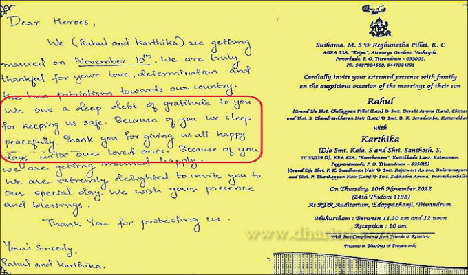 ଥିରୁଭାନନ୍ତପୁରମ୍: ବିବାହ ସମସ୍ତଙ୍କ ଜୀବନରେ ବହୁତ ଖାସ ମୁହୂର୍ତ୍ତ ହୋଇଥାଏ। ଏଥିସହ ବିବାହକୁ ସ୍ମରଣୀୟ କରିବାକୁ ମଧ୍ୟ ସମସ୍ତେ ଚାହିଁଥାନ୍ତି। ତେବେ ଏପରି ଘଟଣା ସାମ୍ନାକୁ ଆସିଛି, ଯେଉଁଥିରେ ବିବାହ କରିବାକୁ ଯାଉଥିବା ଦମ୍ପତି ସମସ୍ତ ଭାରତୀୟ ଆର୍ମିଙ୍କୁ ତାଙ୍କ ବିବାହ ପାଇଁ ନିମନ୍ତ୍ରଣ କରିଥିବା ସୋସିଆଲ ମିଡିଆରେ ଭାଇରାଲ ହେଉଛି। ନଭେମ୍ବର ୧୦ରେ ବିବାହ କରିଥିବା କେରଳର ଦମ୍ପତି ରାହୁଲ ଏବଂ କାର୍ତ୍ତିକା ସମସ୍ତ ଭାରତୀୟ ଆର୍ମିଙ୍କୁ ନିମନ୍ତ୍ରଣ ପଠାଇଥିବା ଜଣାପଡିଛି। ସେ ଚିଠିରେ ଲେଖିଛନ୍ତି, ‘ ଆମେ ଦୁହେଁ ନଭେମ୍ବର ୧୦ରେ ବିବାହ କରିବାକୁ ଯାଉଛୁ। ଆପଣମାନେ ଆମକୁ ଏବଂ ଦେଶକୁ ବାହ୍ୟ ଶତ୍ରୁଙ୍କଠାରୁ ରକ୍ଷା କରୁଛନ୍ତି, ଫଳରେ ଆମେ ଘରେ ଆରାମରେ ଶୋଇପାରୁଛୁ। ବାହାରେ ବୁଲି ପାରୁଛୁ। ସେଥିପାଇଁ ଆପଣଙ୍କ ପାଖରେ ଆମେ ଚିର ରୁଣୀ। ଆମେ ଦୁହେଁ ବହୁତ ଖୁସି ଅଛୁ। ଆମର ଏହି ଖୁସିର ମୁହୂର୍ତ୍ତରେ ଆପଣଙ୍କୁ ଆମନ୍ତ୍ରିତ କରି ଆଶୀର୍ବାଦ କାମନା କରୁଛୁ।’ ଭାରତୀୟ ସେନା ଏହାର ଉତ୍ତର ଦେବାକୁ ଯାଇ ଲେଖିଛନ୍ତି, ‘ବେଷ୍ଚ୍ ୱିସେସ୍। ବିବାହ ନିମନ୍ତ୍ରଣ ପାଇଁ ଦୁହିଙ୍କୁ ଅଶେଷ ଅଶେଷ ଧନ୍ୟବାଦ। ତୁମ ବିବାହ ଜୀବନ ପାଇଁ ଶୁଭକାମନା।’ ଏଥିସହ ଅନେକ ଲୋକ ମଧ୍ୟ ଲଗାତାର ଏଥିରେ କମେଣ୍ଟ କରୁଥିବା ଦେଖିବାକୁ ମିଳୁଛି।