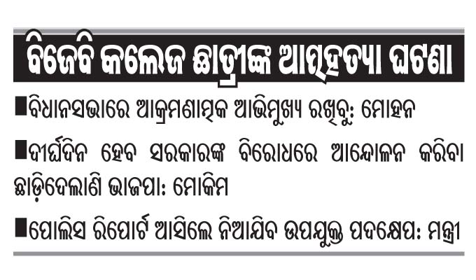 ଭାଜପା ବିଧାୟକ ମୋହନ ଚରଣ ମାଝି କହିଛନ୍ତି, ବିଜେବି ଛାତ୍ରୀଙ୍କ ଆତ୍ମହତ୍ୟା ଘଟଣା ବିଧାନସଭାରେ ଉଠାଯିବ। ଭାଜପା ଏହି ପ୍ରସଙ୍ଗରେ ନିଜ ଆଭିମୁଖ୍ୟ ଆକ୍ରମଣାତ୍ମକ ରଖିବ। ଏହି ଘଟଣାକୁ ସେମାନେ ନିନ୍ଦା କରୁଛନ୍ତି। ବାରମ୍ବାର ରାଜ୍ୟରେ ଏଭଳି ଘଟଣା ଘଟୁଛି। ହେଲେ ସରକାର ଏହା ବିରୋଧରେ କୌଣସି ଠୋସ୍‌ ପଦକ୍ଷେପ ନେବାରେ ବିଫଳ ହେଉଛନ୍ତି। ସ୍କୁଲ, କଲେଜ ଛାତ୍ରୀଛାତ୍ରଙ୍କୁ ସୁରକ୍ଷା ଦେବାରେ ସରକାର ଫେଲ୍‌ ମାରିଛନ୍ତି। ଘରୋଇ କଲେଜ ଗୁଡ଼ିକରେ ଏପରି ଘଟଣା ହେବା କଥା ଜଣାଥିଲା, ହେଲେ ସରକାରୀ କଲେଜ ପିଲାଙ୍କୁ ଏଭଳି ପରିସ୍ଥିତିର ସାମ୍ନା କରିବାକୁ ପଡ଼ିବା କଥା ଜଣା ନ ଥିଲା ବୋଲି ମୋହନ କହିଛନ୍ତି। ଅନ୍ୟପଟେ ଭାଜପା ଏହି ଘଟଣାରେ ରାସ୍ତାକୁ ଓହ୍ଲାଇବ କି ବୋଲି ମୋହନଙ୍କୁ ପଚାରିବାରୁ ସେଏନେଇ କିଛି କହିପାରିବେ ନାହିଁ, ଦଳର ନେତୃତ୍ୱ କହିପାରିବେ ବୋଲି କହିଛନ୍ତି।