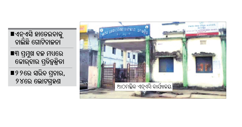 ଆଠମଲ୍ଲିକର କଇଁତ୍ରାଗଡ ଓ ନଅଁଗା ପଞ୍ଚାୟତର ୩ଟି ଗ୍ରାମକୁ ନେଇ ୧୯୯୬ ମସିହାରେ ଆଠମଲ୍ଲିକ ଏନ୍ଏସି ଗଠନ ହୋଇଥିଲା। ୧୧ ୱାର୍ଡ ବିଶିଷ୍ଟ ଏହି ଏନ୍ଏସିର ଲୋକସଂଖ୍ୟା ୧୨,୨୯୮ ହୋଇଥିବାବେଳେ ୯,୭୮୧ ଭୋଟର ରହିଛନ୍ତି। ସେମାନଙ୍କ ମଧ୍ୟରେ ୪୮୯୭ ମହିଳା ଭୋଟର ଓ ୪୮୮୪ ପୁରୁଷ ଭୋଟର ଅଛନ୍ତି। ୧୯୯୭ ପୌର ନିର୍ବାଚନରେ ଏଠାରେ କଂଗ୍ରେସ ବିଜୟୀ ହୋଇଥିଲା। ୨୦୦୩ରେ ଏହା ବିଜେଡି ଦଖଲକୁ ଯାଇଥିଲା। ତେବେ ପରବର୍ତ୍ତୀ ୨୦୦୮ ଓ ୨୦୧୩ ନିର୍ବାଚନରେ କଂଗ୍ରେସ ଆଠମଲ୍ଲିକ ଏନ୍ଏସି ଅକ୍ତିଆର କରିବା ସହ ଏହାକୁ ନିଜ ଗଡ଼ ବୋଲି ଦାବି କରିଆସୁଛି। ସେହି ଆଧାରରେ ଚଳିତ ନିର୍ବାଚନ ଦଳ ଜିତିବ ବୋଲି କହୁଛି। ଏଥର ଅଧ୍ୟକ୍ଷ ପଦ ମହିଳାଙ୍କ ପାଇଁ ସଂରକ୍ଷିତ ଥିବାବେଳେ ୫ଜଣ ନିର୍ବାଚନ ମଇଦାନରେ ରହିଛନ୍ତି। ବିଜେଡିରୁ ଆଶା କୁମାରୀ ସାହୁ, ଭାଜପାରୁ ଯୋଗମାୟା ପ୍ରିୟଦର୍ଶନୀ ମହାପାତ୍ର ଓ କଂଗ୍ରେସରୁ ରଞ୍ଜିତା ସିଂହ ପ୍ରାର୍ଥୀ ହୋଇଥିବାବେଳେ ସ୍ବାଧୀନ ଭାବେ ନୀହାର ହୋତା ଏବଂ ସରଜୁ ସିଂହ ସାମନ୍ତ ଲଢ଼ୁଛନ୍ତି। ସେହିପରି ୧୧ କାଉନସିଲର ପଦବୀ ପାଇଁ ୪୦ ଜଣ ପ୍ରାର୍ଥୀ ରହିଛନ୍ତି। କଂଗ୍ରେସ ପ୍ରାର୍ଥୀଙ୍କ ପାଇଁ ବରିଷ୍ଠ ନେତା ବିଜୟାନଦ ଚାଉଳିଆ ପ୍ରଚାର ମଙ୍ଗ ଧରିଛନ୍ତି। ଅପରପକ୍ଷରେ କଂଗ୍ରେସ ଗଡ଼ ଭାଙ୍ଗି ଏହି ଏନ୍ଏସି ଦଖଲ କରିବାକୁ ବିଜେଡି ରଣନୀତି ପ୍ରସ୍ତୁତ କରିଛି। ପଞ୍ଚାୟତ ନିର୍ବାଚନ ପରି ପୌର ନିର୍ବାଚନରେ ଦଳୀୟ ପ୍ରାର୍ଥୀଙ୍କୁ ବିଜୟୀ କରିବାକୁ ବରିଷ୍ଠ ନେତା ତଥା ପର୍ଯ୍ୟବେକ୍ଷକ ଦାୟିତ୍ୱରେ ଥିବା ନଳିନୀକାନ୍ତ ପ୍ରଧାନ ପ୍ରଚାର ମଙ୍ଗ ଧରିବା ସହ ଗୋଟିଚାଳନା କରୁଛନ୍ତି। ଭାଜପା ପ୍ରାର୍ଥୀମାନଙ୍କ ପାଇଁ ବରିଷ୍ଠ ନେତା ରୁଦ୍ରନାରାୟଣ ପାଣି, ପୂର୍ବତନ ବିଧାୟକ ସଞ୍ଜୀବ କୁମାର ସାହୁ, ସମ୍ବଲପୁର ଏମ୍ପିଙ୍କ ପ୍ରତିନିଧି ପରେଶ ଦେଓ ବିଭିନ୍ନ ୱାର୍ଡ ବୁଲି କେନ୍ଦ୍ର ସରକାରଙ୍କ ଯୋଜନା ସମ୍ପର୍କରେ ଭୋଟରଙ୍କୁ ଅବଗତ କରାଉଛନ୍ତି। ୨୨ ତାରିଖରେ ପ୍ରଚାର ଶେଷ ହେବାକୁ ଥିବାରୁ ହାତରେ ମାତ୍ର ୨ ଦିନ ରହିଛି। ତେଣୁ ୩ ପ୍ରମୁଖ ଦଳ ଜନସମର୍ଥନ ହାସଲ ନିମନ୍ତେ ଶେଷ ପ୍ରୟାସ ଜାରି ରଖିଛନ୍ତି। ଏ ସମ୍ପର୍କରେ ନିର୍ବାଚନ ଦାୟିତ୍ୱରେ ଥିବା ଆଠମଲ୍ଲିକ ତହସିଲଦାର ସୋଫି ସାଇନିକା କହିଛନ୍ତି, ପ୍ରଶାସନ ପକ୍ଷରୁ କିଭଳି ନିର୍ବାଚନରେ ସ୍ବଚ୍ଛତା ରକ୍ଷା କରାଯିବ ସେ ଦିଗରେ ବ୍ୟାପକ ପ୍ରସ୍ତୁତି କରାଯାଇଛି।