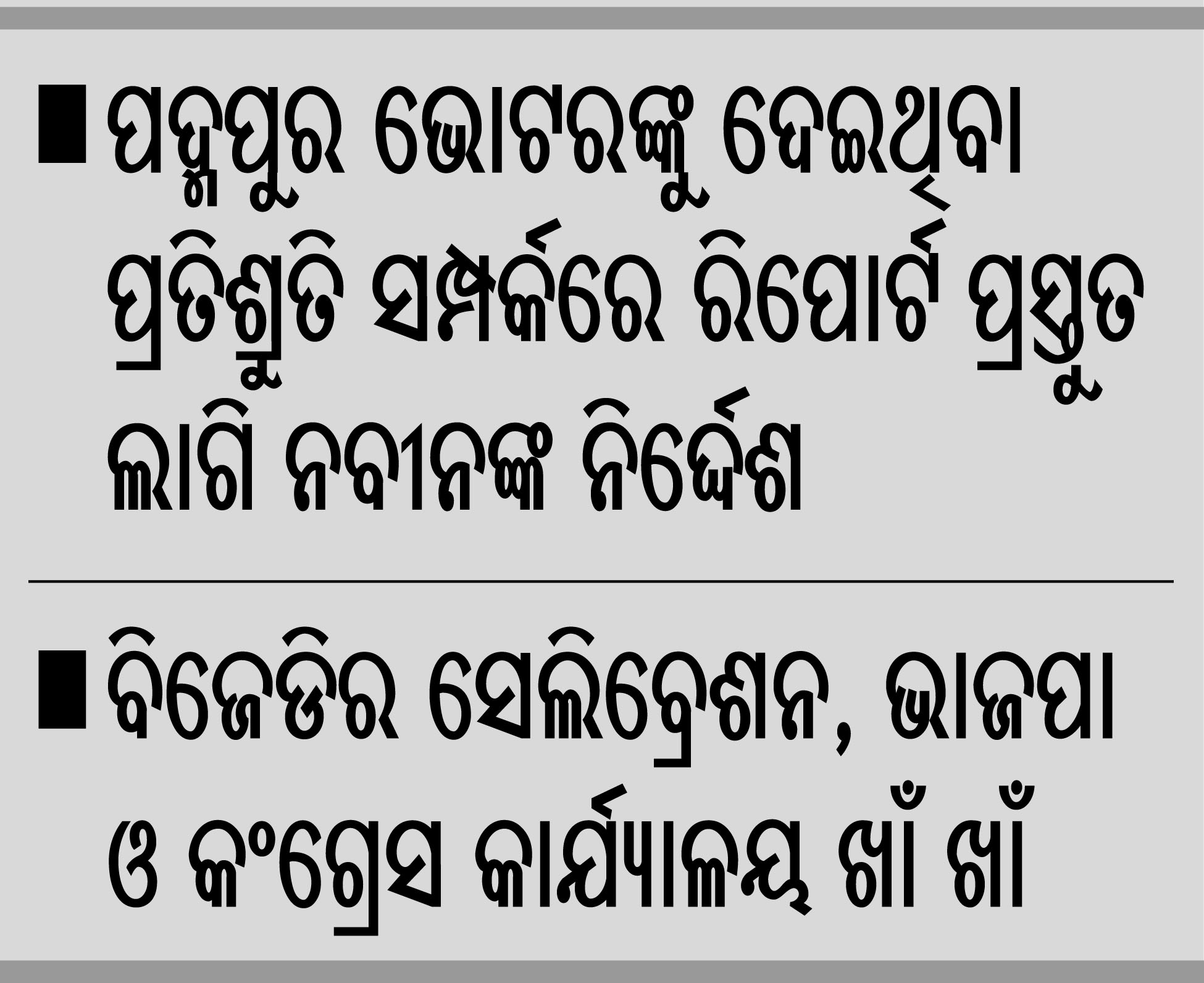 ମିଳିଥିବା ସୂଚନା ମୁତାବକ, ବିଜେଡି ପକ୍ଷରୁ ପଦ୍ମପୁର ନିର୍ବାଚନମଣ୍ଡଳୀ ଦାୟିତ୍ୱରେ ଥିବା ନେତାମାନଙ୍କୁ ଭୋଟ ଗଣତିର ପୂର୍ବଦିନ ଅର୍ଥାତ୍ ବୁଧବାର ମୁଖ୍ୟମନ୍ତ୍ରୀ ନବୀନ ନିବାସ ଡକାଇ ଆଲୋଚନା କରିଥିଲେ। ଏହି ଅବସରରେ ମୁଖ୍ୟମନ୍ତ୍ରୀ ସମସ୍ତଙ୍କୁ ଗୋଟିଏ କଥା ଉପରେ ଗୁରୁତ୍ୱ ଦେବା ଲାଗି କହିଥିଲେ। ଯେଉଁମାନେ ପଦ୍ମପୁରର ବିଭିନ୍ନ ପଞ୍ଚାୟତ ଦାୟିତ୍ୱରେ ରହିଥିଲେ ସେମାନେ ସ୍ଥାନୀୟ ବାସିନ୍ଦାଙ୍କୁ ଯାହାସବୁ ପ୍ରତିଶ୍ରୁତି ଦେଇ ଫେରିଛନ୍ତି ତାକୁ ତୁରନ୍ତ ପାଳନ କର। ତେଣୁ ଆସନ୍ତା ୧୫ କିମ୍ବା ୧୭ ତାରିଖରେ ପଦ୍ମପୁରର ଯେଉଁ ନେତା ଯେଉଁଠି ଦାୟିତ୍ୱରେ ଥିଲେ ସେଠାକୁ ଯାଇ ସେ ବିଷୟରେ ଆଲୋଚନା କରି କାର୍ଯ୍ୟ ଆରମ୍ଭ ଲାଗି ପ୍ରସ୍ତୁତ ହେବେ। ଆସନ୍ତା ୬ ମାସ ମଧ୍ୟରେ ସେହି ସବୁ କାର୍ଯ୍ୟ ପାଇଁ ନବନିଯୁକ୍ତ ବିଧାୟିକାଙ୍କୁ ସାଙ୍ଗରେ ନେଇ ନଡ଼ିଆ ବାଡ଼େଇବାକୁ ମୁଖ୍ୟମନ୍ତ୍ରୀ ନିର୍ଦ୍ଦେଶ ଦେଇଛନ୍ତି। ଯାହାସବୁ ପ୍ରତିଶ୍ରୁତି ପଦ୍ମପୁରବାସୀଙ୍କୁ ଦିଆଯାଇଥିଲା ତାହା ପାଳନ କରାଯିବ ବୋଲି ସେ କହିଛନ୍ତି। ଅନ୍ୟପଟେ ପଦ୍ମପୁରବାସୀଙ୍କୁ ଦିଆଯାଇଥିବା ପ୍ରତିଶ୍ରୁତି ପୂରଣ କରି ଦଳ ରାଜ୍ୟବ୍ୟାପୀ ଏକ ବାର୍ତ୍ତା ଦେବାକୁ ଚାହୁଁଥିବା ବିଶେଷ ସୂତ୍ରରୁ ଜଣାପଡୁଛି। ଆଗକୁ ୨୦୨୪ ସାଧାରଣ ନିର୍ବାଚନକୁ ଆଉ ପାଖାପାଖି ବର୍ଷେ ଥିବାରୁ ଦଳ ପଦ୍ମପୁରରେ ପ୍ରତିଶ୍ରୁତି ସବୁ ପାଳନ କରି ତା’ର ଫାଇଦା ନେବାକୁ ଚେଷ୍ଟା କରିବ ବୋଲି ସୂଚନା ମିଳିଛି।