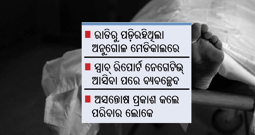 ଅନୁଗୋଳ ଅଫିସ୍, ୧୩ା୭: ଅନୁଗୋଳ ଜିଲା ମୁଖ୍ୟ ଚିକିତ୍ସାଳୟରେ ଚିକିତ୍ସାଧୀନ ଜଣେ ରୋଗୀଙ୍କ ମୃତ୍ୟୁ ପରେ କରୋନା ସନ୍ଦେହରେ ଦୀର୍ଘ ୧୪ ଘଣ୍ଟା ମୃତଦେହ ପକାଇ ରଖାଯାଇଥିଲା। ରବିବାର ଅପରାହ୍ନ ୪ଟାରେ ସ୍ବାବ୍ ରିପୋର୍ଟ ନେଗେଟିଭ୍ ଆସିବା ପରେ ଶବ ବ୍ୟବଚ୍ଛେଦ କରାଯାଇ ହସ୍ତାନ୍ତର କରାଯାଇଥିଲା। ମେଡିକାଲ କର୍ତ୍ତୃପକ୍ଷଙ୍କ ଏପରି କାର୍ଯ୍ୟକୁ ନେଇ ମୃତକଙ୍କ ପରିବାର ଲୋକେ ଅସନ୍ତୋଷ ପ୍ରକାଶ କରିଛନ୍ତି।