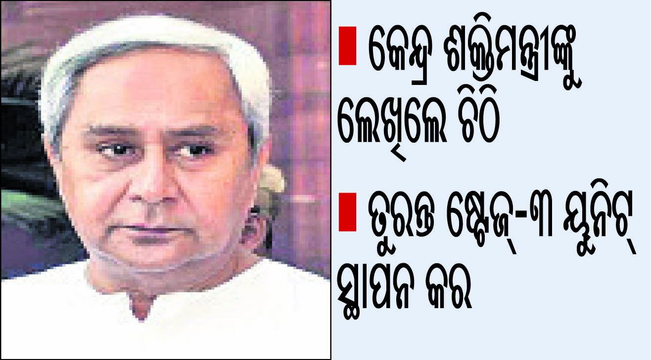 ଭୁବନେଶ୍ୱର, ୨୫ା୩(ବ୍ୟୁରୋ):ଏନ୍‌ଟିପିସି ପରିଚାଳନାଧୀନ ତାଳଚେର ଥର୍ମାଲ ପାଓ୍ବାର ଷ୍ଟେଶନ (ଟିଟିପିଏସ୍‌) ବନ୍ଦ ନେଇ ମୁଖ୍ୟମନ୍ତ୍ରୀ ନବୀନ ପଟ୍ଟନାୟକ ଉଦ୍‌ବେଗ ପ୍ରକାଶ କରିଛନ୍ତି। ରାଜ୍ୟ ସରକାରଙ୍କ ଉଚ୍ଚସ୍ତରୀୟ କ୍ଲିୟରାନ୍ସ କମିଟି ଷ୍ଟେଜ୍‌-୩ ପ୍ରକଳ୍ପ ସ୍ଥାପନ କରିବାକୁ ଅନୁମୋଦନ ଦେଇସାରିଥିବାରୁ ତୁରନ୍ତ ଉକ୍ତ କାର୍ଯ୍ୟ ଆରମ୍ଭ ନିମନ୍ତେ କେନ୍ଦ୍ର ଶକ୍ତି ରାଷ୍ଟ୍ରମନ୍ତ୍ରୀ (ସ୍ବାଧୀନ) ଆର୍‌.କେ. ସିଂଙ୍କୁ ମୁଖ୍ୟମନ୍ତ୍ରୀ ବୁଧବାର ଚିଠି ଲେଖିଛନ୍ତି।