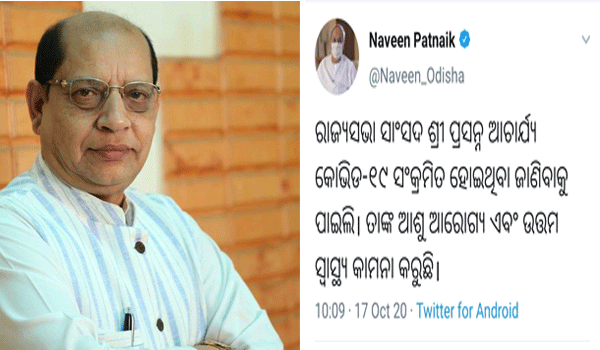 ବରଗଡ଼ ଅଫିସ,୧୭।୧୦: ରାଜ୍ୟସଭା ଏମ୍ପି ପ୍ରସନ୍ନ ଆଚାର୍ଯ୍ୟ କରୋନା (କୋଭିଡ୍-୧୯)ରେ ଆକ୍ରାନ୍ତ ହୋଇଛନ୍ତି। ଏ ନେଇ ମୁଖ୍ୟମନ୍ତ୍ରୀ ନବୀନ ପଟ୍ଟନାୟକ ଟୁଇଟ୍କରି ଏମ୍ପି ଆଚାର୍ଯ୍ୟଙ୍କ ଆଶୁ ଆରୋଗ୍ୟ କାମନା କରିଛନ୍ତି।