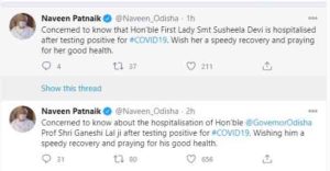 ମୁଖ୍ୟମନ୍ତ୍ରୀ ଟୁଇଟ୍ରେ ଲେଖିଛନ୍ତି, ‘ମାନ୍ୟବର ରାଜ୍ୟପାଳ ପ୍ରଫେସର ଗଣେଶୀ ଲାଲ କରୋନା ଆକ୍ରାନ୍ତ ହୋଇ ହସ୍ପିଟାଲରେ ଭର୍ତ୍ତି ହୋଇଥିବା ଜାଣି ମୁଁ ଚିନ୍ତିତ। ତାଙ୍କର ଆଶୁ ଆରୋଗ୍ୟ କାମନା କରୁଛି। ଖୁବ୍ଶୀଘ୍ର ସେ ସୁସ୍ଥ ହୁଅନ୍ତୁ ବୋଲି ପ୍ରାର୍ଥନା କରୁଛି।