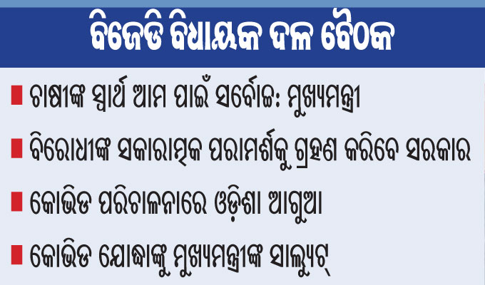 ଓଡ଼ିଶାର ଜନସାଧାରଣଙ୍କ ସହଯୋଗ ଏବଂ କୋଭିଡ ଯୋଦ୍ଧାମାନଙ୍କ ଉତ୍ସର୍ଗୀକୃତ ସେବା ଯୋଗୁ ଓଡ଼ିଶା ଏହି ମହାମାରୀ ବିରୋଧରେ ସାହସର ସହ ଲଢେଇ ଜାରି ରଖିଛି। କରୋନା ଆରୋଗ୍ୟ ହାରରେ ଓଡ଼ିଶା ଦେଶରେ ଆଗରେ ରହିଛି। କୋଭିଡ ପରିଚାଳନା କ୍ଷେତ୍ରରେ ଓଡ଼ିଶା ଦେଶରେ ପ୍ରଥମ ରାଜ୍ୟ ଭାବେ କୋଭିଡ ହସ୍ପିଟାଲ ସ୍ଥାପନ କରିବା ସହ ଅସ୍ଥାୟୀ ମେଡିକାଲ କ୍ୟାମ୍ପ (ଟିଏମସି) ଏବଂ ପଞ୍ଚାୟତଗୁଡିକୁ ସଶକ୍ତ କରିବା ଦିଗରେ ମୁଖ୍ୟ ଭୂମିକା ଗ୍ରହଣ କରିଛି। ଓଡ଼ିଶା ହେଉଛି ଏକମାତ୍ର ରାଜ୍ୟ ଯାହାକି କୋଭିଡ ରୋଗୀଙ୍କୁ ସମସ୍ତ ସେବା ମାଗଣାରେ ଯୋଗାଇ ଆସିଛି। ଜୀବନବିନ୍ଦୁ ଓ ମୋ ପରିବାର କାର୍ଯ୍ୟକ୍ରମ ଜରିଆରେ ସମସ୍ତ ସଦସ୍ୟ ରକ୍ତ ପ୍ଲାଜମା ଦେବା ପାଇଁ ପ୍ରୋତ୍ସାହିତ କରିବା ସହ ମୃତ ବ୍ୟକ୍ତିଙ୍କ ଶବଦାହ କାର୍ଯ୍ୟ କରିବାକୁ ମୁଖ୍ୟମନ୍ତ୍ରୀ ବିଧାୟକମାନଙ୍କୁ ପରାମର୍ଶ ଦେଇଛନ୍ତି। ଆସନ୍ତା ଗାନ୍ଧୀ ଜୟନ୍ତୀରୁ କୋଭିଡ ଗାଇଡ ଲାଇନ ଅନୁସାରେ ଲୋକମାନଙ୍କୁ ମାସ୍କ ପିନ୍ଧିବା ସହ ହାତ ଧୋଇବା, ସାମାଜିକ ଦୂରତା ରକ୍ଷାକରିବା ପାଇଁ ସତେତନତା କାର୍ଯ୍ୟକ୍ରମ ଆରମ୍ଭ କରିବାକୁ ମୁଖ୍ୟମନ୍ତ୍ରୀ ପରାମର୍ଶ ଦେଇଛନ୍ତି।