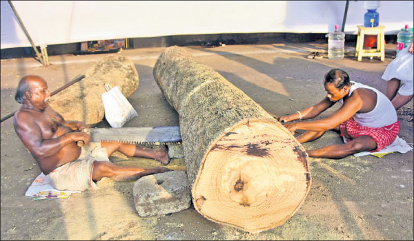 ପୁରୀ ଅଫିସ, ୨୫ା୪: ଆସନ୍ତା ଜୁନ୍ ୨୦ରେ ଘୋଷଯାତ୍ରା। ଶ୍ରୀକ୍ଷେତ୍ରରେ ମହାପ୍ରଭୁଙ୍କ ବିଶ୍ୱପ୍ରସିଦ୍ଧ ଘୋଷଯାତ୍ରା ପାଇଁ ରଥ ନିର୍ମାଣ ଶୁଭାରମ୍ଭ ହୋଇଛି। ରବିବାର ପବିତ୍ର ଅକ୍ଷୟ ତୃତୀୟାରେ ରଥ କାମ ଅନୁକୂଳ ହେବା ପରେ ସୋମବାରଠାରୁ ଶ୍ରୀନଅର ସମ୍ମୁଖ ଅସ୍ଥାୟୀ ରଥଖଳାରେ ବିଧିବଦ୍ଧ ଭାବେ ରଥ ନିର୍ମାଣ ଆରମ୍ଭ ହୋଇଛି। ପରମ୍ପରା ଅନୁଯାୟୀ, ପ୍ରଥମ ଦିନରେ ତିନିରଥର ତୁମ୍ବ କାର୍ଯ୍ୟ ଆରମ୍ଭ କରାଯାଇଛି। ତିନିରଥର ମୁଖ୍ୟ ବିଶ୍ୱକର୍ମା ମହାରଣାଙ୍କ ନିର୍ଦ୍ଦେଶ ଅନୁଯାୟୀ, ପ୍ରାଥମିକ ପର୍ଯ୍ୟାୟରେ ରଥ ଚକ ପାଇଁ ତୁମ୍ବ ନିର୍ମାଣ କାର୍ଯ୍ୟ ଜାରି ରହିଛି। ତିନିରଥ ନିମନ୍ତେ ମୋଟ ୪୨ଟି ତୁମ୍ବ ନିର୍ମାଣ ହେବ। ପ୍ରଥମ ଦିନରେ ରଥଖଳାରେ ତିନିରଥର ମୁଖ୍ୟ ମହାରଣାଙ୍କ ସମେତ ଭୋଇ ସେବକ, କରତି ସେବକଙ୍କ ଉପସ୍ଥିତିରେ ତୁମ୍ବ ପାଇଁ ଆବଶ୍ୟକ ଫାସିକାଠରେ ଚିହ୍ନ ଦିଆଯାଇଥିଲା। ପରେ କରତି ସେବକମାନେ ତିନିରଥ ପାଇଁ ଉଦ୍ଦିଷ୍ଟ ଫାସିକାଠକୁ ମାପ ପ୍ରକାରେ ଗଡ଼ କରି ତାଳଧ୍ୱଜ ଚାଳି, ଦର୍ପଦଳନ ଚାଳି ଏବଂ ନନ୍ଦିଘୋଷ ଚାଳିକୁ ଦୁଇଟି ଲେଖାଏ ତୁମ୍ବ ଯୋଗାଇଥିଲେ। ଏହାପରେ ତିନିରଥର ମହାରଣା ତୁମ୍ବ ଗଡ଼ରେ ଘେରମାପ ଚିହ୍ନ ଦେବା ପରେ ମହାରଣାମାନେ ତୁମ୍ବଗଡ଼କୁ ବାରିସିରେ ହାଣି ତିନିରଥ ଲାଗି ଗୋଟିଏ ଲେଖାଏ ତୁମ୍ବ ନିର୍ମାଣ କରିଛନ୍ତି। ସେହିପରି କମାର ସେବକମାନେ ଦୋଳବେଦିଠାରେ ଅସ୍ଥାୟୀ କମାରଶାଳ ପ୍ରସ୍ତୁତ ସହ ପୂଜାର୍ଚ୍ଚନା ସାରିଛନ୍ତି। ଏଠାରେ ତିନିରଥ ପାଇଁ ଆବଶ୍ୟକ କଣ୍ଟା ତିଆରି କରାଯିବ। ତିନିରଥ ପାଇଁ ୪୨ ତୁମ୍ବ ଆବଶ୍ୟକ। ତନ୍ମଧ୍ୟରୁ ପ୍ରଭୁ ବଳଭଦ୍ରଙ୍କ ତାଳଧ୍ୱଜ ରଥ ପାଇଁ ୧୪, ମା’ ସୁଭଦ୍ରାଙ୍କ ଦେବଦଳନ ରଥ ନିମନ୍ତେ ୧୨ ଏବଂ ମହାପ୍ରଭୁ ଶ୍ରୀଜଗନ୍ନାଥଙ୍କ ନନ୍ଦିଘୋଷ ରଥ ସକାଶେ ୧୬ଟି ତୁମ୍ବ ନିର୍ମାଣ କରାଯିବ। ଶ୍ରୀଜଗନ୍ନାଥ ଏବଂ ବଳଭଦ୍ରଙ୍କ ରଥର ତୁମ୍ବ ସାଇଜ ୨ ଫୁଟ ୮ ଇଞ୍ଚ, ସୁଭଦ୍ରାଙ୍କ ରଥର ତୁମ୍ବ ସାଇଜ ୩ ଫୁଟ ରହିବ। ତୁମ୍ବ ନିର୍ମାଣ ପାଇଁ ଫାସିକାଠ ବ୍ୟବହାର ହେବ। ପ୍ରଥମ ଦିନରେ ମହାରଣା ୧୦, ଭୋଇ ସେବକ ୬, କରତି ସେବକ ୪, କମାର ସେବକ ୬ ଏବଂ ରଥ ଖଳା ସହାୟକ ଜଣଙ୍କୁ ମିଶାଇ ମୋଟ ୨୭ଜଣ ନିୟୋଜିତ ଥିଲେ। ନନ୍ଦିଘୋଷ ରଥର ମୁଖ୍ୟ ବିଶ୍ୱକର୍ମା ମହାରଣା ସେବକ ବିଜୟ କୁମାର ମହାପାତ୍ର କହିଛନ୍ତି, ଗତବର୍ଷ ଭଳି ଚଳିତ ବର୍ଷ ପ୍ରଶାସନ ପକ୍ଷରୁ ଅନୁରୁୁପ ବ୍ୟବସ୍ଥା କରାଯାଇଛି। ଖଳା ଚାରିପଟେ କନା ଲଗାଯାଇଛି। ଲାଇଟ୍ ବ୍ୟବସ୍ଥା ହୋଇଛି। ପ୍ରଥମ ପର୍ଯ୍ୟାୟରେ ତୁମ୍ବ କାର୍ଯ୍ୟ ଚାଲିଛି। ତୁମ୍ବ ପାଇଁ କରତିଆମାନେ ମାପ ଅନୁଯାୟୀ କାଠ କାଟୁଛନ୍ତି ବୋଲି ସେ ସୂଚନା ଦେଇଛନ୍ତି। ଶ୍ରୀମନ୍ଦିରର ବରିଷ୍ଠ ତତ୍ତ୍ୱାବଧାରକ ସୁଦର୍ଶନ ମେକାପ କହିଛନ୍ତି, ପର୍ଯ୍ୟାୟ କ୍ରମେ ରଥଖଳାକୁ ରଥକାଠ ଆସି ପହଞ୍ଚୁଛି। ସମ୍ପ୍ରତି ତୁମ୍ବ ନିର୍ମାଣ ଚାଲିଛି, ଯାହା ଦୁଇ ତିନି ଦିନ ଲାଗିବ। ସେହିପରି କରତି ସେବକ ରଞ୍ଜିତ ମହାରଣା କହିଛନ୍ତି, ତିନିବାଡ଼ରେ ୪ଜଣ କରତି ସେବକ କାମ କରୁଛୁ। ତୁମ୍ବ ପାଇଁ ଚିହ୍ନ ଦେବା ପରେ କାଠ କଟାଯାଇଛି। ପର୍ଯ୍ୟାୟ କ୍ରମେ ତୁମ୍ବ କାଟି ମହାରଣାଙ୍କୁ ଯୋଗାଇଦେବୁ।