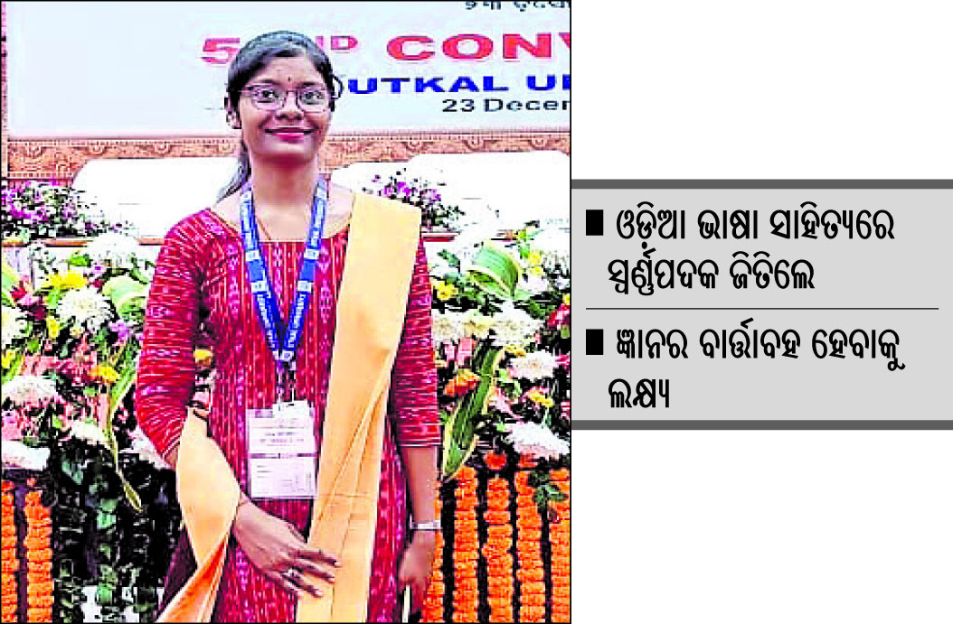 ରସୁଲପୁର,୨୬ା୧୨(ଡି.ଏନ.ଏ.):ରସୁଲପୁର ବ୍ଲକ ଅଧୀନ ଓଡ଼ିଶୋ ପଞ୍ଚାୟତ ମାନପୁର ଗାଁର ପରିବା ବ୍ୟବସାୟୀ ନାରାୟଣ ପଣ୍ଡାଙ୍କ ଝିଅ ସଂଘମିତ୍ରା ପଣ୍ଡା ଉତ୍କଳ ବିଶ୍ୱବିଦ୍ୟାଳୟ ଟପ୍ପର ହୋଇଛନ୍ତି। ସେ ବିଶ୍ୱବିଦ୍ୟାଳୟରେ ଓଡ଼ିଆ ଭାଷା ସାହିତ୍ୟ ବିଷୟ ସ୍ନାତକୋତ୍ତର ପରୀକ୍ଷାରେ ଶ୍ରେଷ୍ଠ ସ୍ଥାନ ଅଧିକାର କରି ସ୍ବର୍ଣ୍ଣପଦକ ହାସଲ କରିଛନ୍ତି। ବିଶ୍ୱବିଦ୍ୟାଳୟ ତରଫରୁ ଆୟୋଜିତ ଏକ ସମାବର୍ତ୍ତନ ଉତ୍ସବରେ ସେ ରାଜ୍ୟପାଳ ପ୍ରଫେସର ଗଣେଶୀ ଲାଲଙ୍କଠାରୁ ପଦକ ସହ ପ୍ରମାଣପତ୍ର ହାସଲ କରିଛନ୍ତି। ଏଥିସହ ତାଙ୍କର ଚୟସ ବେସଡ୍ କ୍ରେଡିଟ୍ ସିଷ୍ଟମ ଜରିଆରେ କରାଯାଇଥିବା ର଼୍ୟାକିଂରେ ତାଙ୍କୁ ଭକ୍ତକବି ମଧୁସୂଦନ ରାଓ ମେମୋରିଆଲ ସଂସ୍ଥା ପକ୍ଷରୁ ଆଉ ଏକ ସ୍ବର୍ଣ୍ଣ ପଦକ ପ୍ରଦାନ କରାଯାଇ ସମ୍ମାନିତ କରାଯାଇଛି।