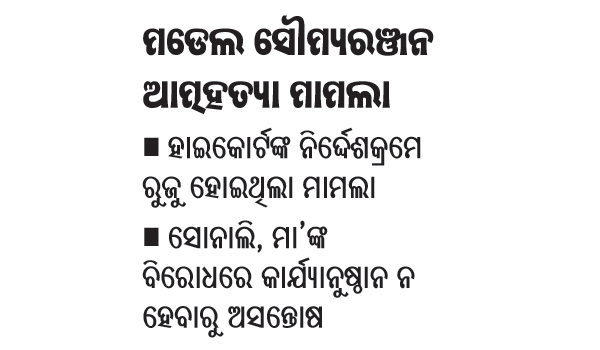 ଭୁବନେଶ୍ୱର, ୧୧।୫(ବ୍ୟୁରୋ): ରାଜଧାନୀର ଇନ୍‌ଫୋସିଟି ଥାନା ଅନ୍ତର୍ଗତ ନନ୍ଦନବିହାରରେ ରହୁଥିବା ମଡେଲ ସୌମ୍ୟ ରଞ୍ଜନ ପାଣିଗ୍ରାହୀଙ୍କ ଆତ୍ମହତ୍ୟା ମାମଲା କମିଶନରେଟ ପୋଲିସ ପାଇଁ ଚିନ୍ତାର ବିଷୟ ପାଲଟିଛି। ହାଇକୋର୍ଟଙ୍କ ନିର୍ଦ୍ଦେଶକ୍ରମେ ପୋଲିସ ଏହି ଘଟଣାର ଅଢ଼େଇ ମାସ ପରେ ଏପ୍ରିଲ ୧୯ରେ ଅଭିଯୁକ୍ତ ପ୍ରେମିକା ସୋନାଲି ନନ୍ଦ ଓ ତାଙ୍କ ମା’ଙ୍କ ନାମରେ ମାମଲା (ନଂ. ୧୦୦/୨୦୨୨) ରୁଜୁ କରିଥିଲା। ତେବେ ଏଯାବତ୍‌ ସେମାନଙ୍କ ବିରୋଧରେ କୌଣସି କାର୍ଯ୍ୟାନୁଷ୍ଠାନ ଗ୍ରହଣ କରାଯାଇନାହିଁ। ତେଣୁ ସୌମ୍ୟଙ୍କ ପରିବାର ଲୋକେ ମଙ୍ଗଳବାର ଭୁବନେଶ୍ୱରର ନୂତନ ଡିସିପି ପ୍ରତୀକ ସିଂଙ୍କୁ ଭେଟି ନ୍ୟାୟ ମାଗିଛନ୍ତି।