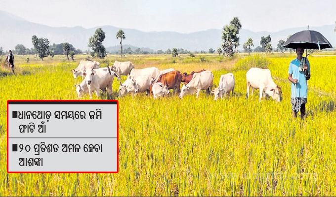 ତେଲକୋଇ,୪ା୧୧(ଡି.ଏନ.ଏ): ଧାନ ଥୋଡ଼ ଧରୁଥିବା ବେଳେ ବର୍ଷା ଏକ ପ୍ରକାର ଉଭାନ୍ ହୋଇଯାଇଛି। ଫଳରେ ଧାନଗଛ ଶୁଖି ମରିଗଲାଣି। ବର୍ଷକର ପରିଶ୍ରମ ଏବେ ମାଟିରେ ମିଶିବାକୁ ବସିଛି। ଚାଷୀ ଉପାୟଶୂନ୍ୟ ହୋଇ କ୍ଷେତରେ ଗୋରୁ ଛାଡ଼ି ଦେଇଥିବା ଦେଖିବାକୁ ମିଳିଛି। ଗୁରୁବାର ଏପରି ଦୃଶ୍ୟ କେନ୍ଦୁଝର ଜିଲାର ତେଲକୋଇ ବ୍ଲକ୍ ଛାମୁଣ୍ଡା ପଞ୍ଚାୟତ ଗୋଳାବନ୍ଧ ଗ୍ରାମରେ ଦେଖିବାକୁ ମିଳିଛି।