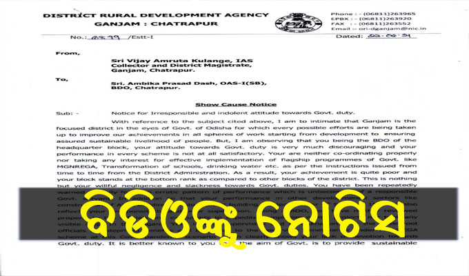 ଛତ୍ରପୁର,୧୯୧୭(ଡି.ଏନ୍.ଏ.): ଗଞ୍ଜାମ ଜିଲା ଛତ୍ରପୁର ବିଡିିଓ ଅମ୍ବିକା ପ୍ରସାଦ ଦାଶଙ୍କୁ କାରଣ ଦର୍ଶାଅ ନୋଟିସ (ନଂ ୬୮୪୯) ଜାରି ହୋଇଛି। ସରକାରୀ କାର୍ଯ୍ୟରେ ଦାୟିତ୍ୱହୀନତା ଓ ଆଳସ୍ୟ ପରାୟଣ ମନୋଭାବ ଯୋଗୁ ତାଙ୍କୁ ଜିଲାପାଳ ବିଜୟ ଅମୃତା କୁଲାଙ୍ଗେ ଏହି ନୋଟିସ ଜାରି ହୋଇଥିବା ଜଣାପଡ଼ିଛି। ୭ଦିନ ମଧ୍ୟରେ ନୋଟିସର ଉତ୍ତର ଦେବାକୁ ଜିଲାପାଳ ନିର୍ଦ୍ଦେଶ ଦେଇଛନ୍ତି।