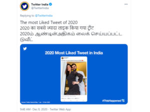 ଦୁହିଁଙ୍କ ଫ୍ୟାନ ଲାଇକ୍ ଓ କମେଣ୍ଟ ମାଧ୍ୟମରେ ଉକ୍ତ ଫଟୋକୁ ଖୁବ୍ ଭଲ ପାଇବା ଦେଇଥିଲେ। ସୋସିଆଲ ମିଡିଆରେ ଖୁବ୍ ଭାଇରାଲ ହୋଇଥିଲା ବିରୁଷ୍କାଙ୍କ ଏହି ଫଟୋ । ଟୁଇଟର ଇଣ୍ଡିଆ କୋହଲିଙ୍କ ଟୁଇଟକୁ ରିଟୁଇଟ୍ କରି କ୍ୟାପଶନରେ ଲେଖିଛନ୍ତି, ୨୦୨୦ର ସର୍ବାଧିକ ପସନ୍ଦ କରାଯାଇଥିବା ଟୁଇଟ୍। ତେବେ ବିରୁଷ୍କାଙ୍କ ଉକ୍ତ ଫଟୋକୁ ୬.୪ ଲକ୍ଷ ଲାଇକ୍ ମିଳିଛି।