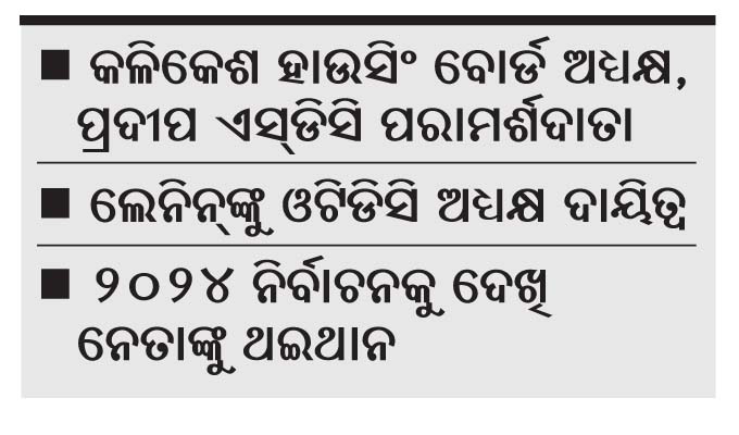 ତେବେ ସରକାର ଜାରି କରିଥିବା ନିଗମ ତାଲିକାରେ ରାଜ୍ୟ ସରକାରଙ୍କ ବିଭିନ୍ନ ନିଗମ ଓ ବୋର୍ଡରେ ଅଧ୍ୟକ୍ଷ, ଉପଦେଷ୍ଟା ଏବଂ ଉପାଧ୍ୟକ୍ଷ ନିଯୁକ୍ତ କରାଯାଇଛି। ଓଡ଼ିଶା ରାଜ୍ୟ ଗୃହ ନିର୍ମାଣ ନିଗମର ଅଧ୍ୟକ୍ଷ ଭାବେ କଳିକେଶ ନାରାୟଣ ସିଂହଦେଓଙ୍କୁ ନିଯୁକ୍ତ କରାଯାଇଥିବାବେଳେ ପ୍ରଭାତ ଆଦିତ୍ୟ ମିଶ୍ରଙ୍କୁ ଆପିକଲ ଅଧ୍ୟକ୍ଷ, ଡ. ବିଶ୍ବନାଥଙ୍କୁ ଓଡ଼ିଶା ରୁରାଲ ହାଉସିଂ ଉନ୍ନୟନ ନିଗମ ଅଧ୍ୟକ୍ଷ, ଲେନିନ୍ ମହାନ୍ତିଙ୍କୁ ଓଡ଼ିଶା ପର୍ଯ୍ୟଟନ ଉନ୍ନୟନ ନିଗମ (ଓଟିଡିସି) ଅଧ୍ୟକ୍ଷ, ଅମରେଶ ପତ୍ରୀଙ୍କୁ ଓଡ଼ିଶା ଉଠାଜଳସେଚନ ନିଗମ ଅଧ୍ୟକ୍ଷ, ସୁବାସ ମହାରଣାଙ୍କୁ ଓଡ଼ିଶା ରାଜ୍ୟ କାଜୁ ଉନ୍ନୟନ ନିଗମ ଅଧ୍ୟକ୍ଷ, ବିଜୟ ନାୟକଙ୍କୁ ଓଡ଼ିଶା ରାଜ୍ୟ ବିହନ ନିଗମ, ଦେବାଶିଷ ମହାନ୍ତିଙ୍କୁ ଓଡ଼ିଶା କୃଷି ଉଦ୍ୟୋଗ ନିଗମ ଅଧ୍ୟକ୍ଷ, ସତ୍ୟବ୍ରତ (କୁନା) ତ୍ରିପାଠୀଙ୍କୁ ଓଡ଼ିଶା ଚଳଚ୍ଚିତ୍ର ଉନ୍ନୟନ ନିଗମ (ଓଏଫଡିସି) ଅଧ୍ୟକ୍ଷ ଭାବେ ନିଯୁକ୍ତି ମିଳିଛି। ସେହିପରି ଶ୍ରୀମୟୀ ମିଶ୍ରଙ୍କୁ ଓଡ଼ିଶା କୋଠାବାଡ଼ି ଏବଂ ଅନ୍ୟାନ୍ୟ ନିର୍ମାଣ ଶ୍ରମିକ କଲ୍ୟାଣ ବୋର୍ଡ ଅଧ୍ୟକ୍ଷା, ଚିନ୍ମୟ ସାହୁଙ୍କୁ ଓଡ଼ିଶା କ୍ଷୁଦ୍ର ଶିଳ୍ପ ନିଗମ ଅଧ୍ୟକ୍ଷ, ମିନତି ବେହେରାଙ୍କୁ ଓଡ଼ିଶା ମହିଳା ଆୟୋଗ ଅଧ୍ୟକ୍ଷା, ସଂଗ୍ରାମ ପାଇକରାୟଙ୍କୁ ଓଡ଼ିଶା ଖଦି ଓ ଗ୍ରାମୋଦ୍ୟୋଗ ବୋର୍ଡ ଅଧ୍ୟକ୍ଷ, ସୁରେନ୍ଦ୍ର ପ୍ରଧାନଙ୍କୁ ଓଡ଼ିଶା ରାଜ୍ୟ କୃଷି ବିପଣନ ବୋର୍ଡ ଉପଦେଷ୍ଟା, କୁନ ବିହାରୀ ଦାସଙ୍କୁ ଓଡ଼ିଶା ରାଜ୍ୟ ଯୁବ କଲ୍ୟାଣ ପରିଷଦ ଅଧ୍ୟକ୍ଷ ଏବଂ ସନ୍ତୋଷ ବେଜଙ୍କୁ ଓଡ଼ିଶା କୃଷି ଉଦ୍ୟୋଗ ନିଗମର ଉପାଧ୍ୟକ୍ଷ ଭାବେ ଦାୟିତ୍ୱ ଦିଆଯାଇଛି।