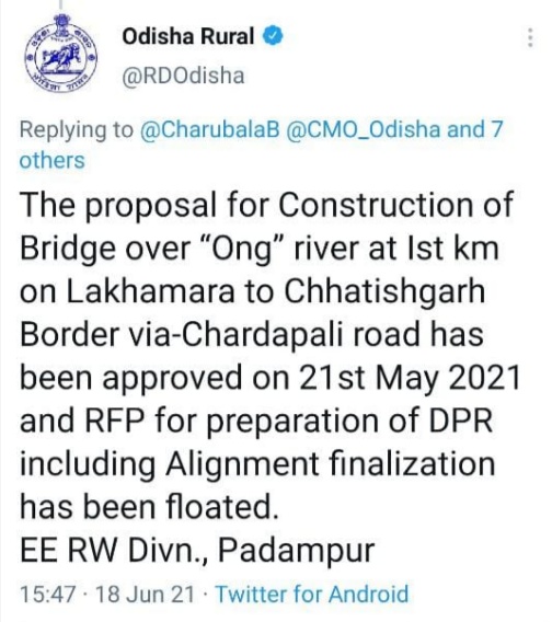 ବରଗଡ଼ ଅଫିସ,୧୮।୬: ବରଗଡ଼ ଜିଲା ପଦ୍ମପୁର ଉପଖଣ୍ଡ ଲଖମରା ଏବଂ ଚର୍ଦାପାଲି ଗ୍ରାମ ଦେଇ ପ୍ରବାହିତ ଅଙ୍ଗନଦୀ ଉପରେ ପୋଲ ନିର୍ମାଣ ପାଇଁ ରାଜ୍ୟ ସରକାର ନିଷ୍ପତ୍ତି ନେଇିଛି । ଜିଲାର ପାଇକମାଲ ବ୍ଲକ ଅନ୍ତର୍ଗତ ଟେମରି ଗ୍ରାମର ସାମାଜିକ କର୍ମୀ ଦୀପା ବାରିକ ପୋଲ ନିର୍ମାଣର ଆବଶ୍ୟକତା ନେଇ ମୁଖ୍ୟମନ୍ତ୍ରୀ, ମୁଖ୍ୟ ଶାସନ ସଚିବଙ୍କୁ ଟୁଇଟ କରିବା ପରେ ଶୁକ୍ରବାର ସରକାରଙ୍କ ପକ୍ଷରୁ ଏହି ସୂଚନା ଦିଆଯାଇଛି। ଅଙ୍ଗ ନଦୀ ଉପରେ ପ୍ରସ୍ତାବିତ ପୋଲ ନିର୍ମାଣ ପାଇଁ ଗତ ୨୧ ତାରିଖରେ ରାଜ୍ୟ ସରକାରଙ୍କ ଅନୁମୋଦନ ମିଳିଛି।