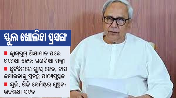 ଅନ୍ୟପକ୍ଷରେ ମୁଖ୍ୟମନ୍ତ୍ରୀଙ୍କ ସମୀକ୍ଷା ପୂର୍ବରୁ ନୂଆବର୍ଷଠାରୁ ସ୍କୁଲ ଖୋଲିବା କଥା ଚିନ୍ତା କରାଯାଉଥିବା ବିଦ୍ୟାଳୟ ଓ ଗଣଶିକ୍ଷା ମନ୍ତ୍ରୀ ସମୀର ଦାଶ ସୂଚନା ଦେଇଥଲେ। ସେହିପରି ଉଚ୍ଚଶିକ୍ଷା ସଚିବ ଶାଶ୍ୱତ ମିଶ୍ର ଉଚ୍ଚ ଶିକ୍ଷାନୁଷ୍ଠାନ ଖୋଲିବା ନେଇ ସଙ୍କେତ ଦେଇଥିଲେ। ସ୍କୁଲ୍ ଖୋଲିବା ସମ୍ପର୍କରେ ମନ୍ତ୍ରୀ କହିଛନ୍ତି, ବର୍ତ୍ତମାନର ପରିସ୍ଥିତିକୁ ଦେଖିଲେ ଏବେ ସ୍କୁଲ୍ ଖୋଲିବା ସମ୍ଭବ ନୁହେଁ। ତେଣୁ ଜାନୁୟାରୀରୁ ଖୋଲାଯିବ। ପ୍ରାଥମିକ ପର୍ଯ୍ୟାୟରେ ହାଇସ୍କୁଲ ଓ ଯୁକ୍ତ ୨ କଲେଜ ଖୋଲାଯାଇ ଦଶମ ଓ ଦ୍ୱାଦଶ ଶ୍ରେଣୀ ପିଲାଙ୍କୁ ଶିକ୍ଷାଦାନ ଦିଆଯିବ। ପରବର୍ତ୍ତୀ ସମୟରେ ପ୍ରାଥମିକ ବିଦ୍ୟାଳୟ ଖୋଲିବା ନେଇ ବିଚାରବିମର୍ଶ ହେବ। ଶନିବାର, ରବିବାର ସହ ଛୁଟି ଦିନରେ ବି କ୍ଲାସ ହେବ। କେବଳ ପର୍ବପର୍ବାଣି ଛୁଟି ବ୍ୟତୀତ ଅନ୍ୟ ସମସ୍ତ ଛୁଟିରେ କ୍ଲାସ୍ କରାଯିବ। ଶହେ ଦିନ ପାଠ ପଢ଼ାଇବା ପରେ ପରୀକ୍ଷା ହେବ। ଏଥର ପ୍ରାୟ ୬ ଲକ୍ଷ ଛାତ୍ରୀଛାତ୍ର ମାଟ୍ରିକ ପରୀକ୍ଷା ଓ ୩.୫ ଲକ୍ଷ ଛାତ୍ରୀଛାତ୍ର ଯୁକ୍ତ ୨ ପରୀକ୍ଷା ଦେବେ। ଛାତ୍ରୀଛାତ୍ରଙ୍କ ଚାପ କମାଇବା ପାଇଁ ସ୍ବତନ୍ତ୍ର ପାଠ୍ୟପୁସ୍ତକ ପ୍ରସ୍ତୁତ ହେବ। କିଛିଦିନ ମଧ୍ୟରେ ମୁଖ୍ୟମନ୍ତ୍ରୀଙ୍କ ଜରିଆରେ ଷ୍ଟଡି ମ୍ୟାଟେରିଆଲ ଲୋକାର୍ପଣ କରାଯାଇ ଛାତ୍ରୀଛାତ୍ରଙ୍କୁ ପ୍ରଦାନ କରାଯିବ। ପାଠପଢା ଶେଷ ହେବା ପରେ ଏପ୍ରିଲ କିମ୍ବା ମେ’ ରେ ପରୀକ୍ଷା କରିବାକୁ ନିଷ୍ପତ୍ତି ନିଆଯିବ ବୋଲି ମନ୍ତ୍ରୀ କହିଛନ୍ତି।